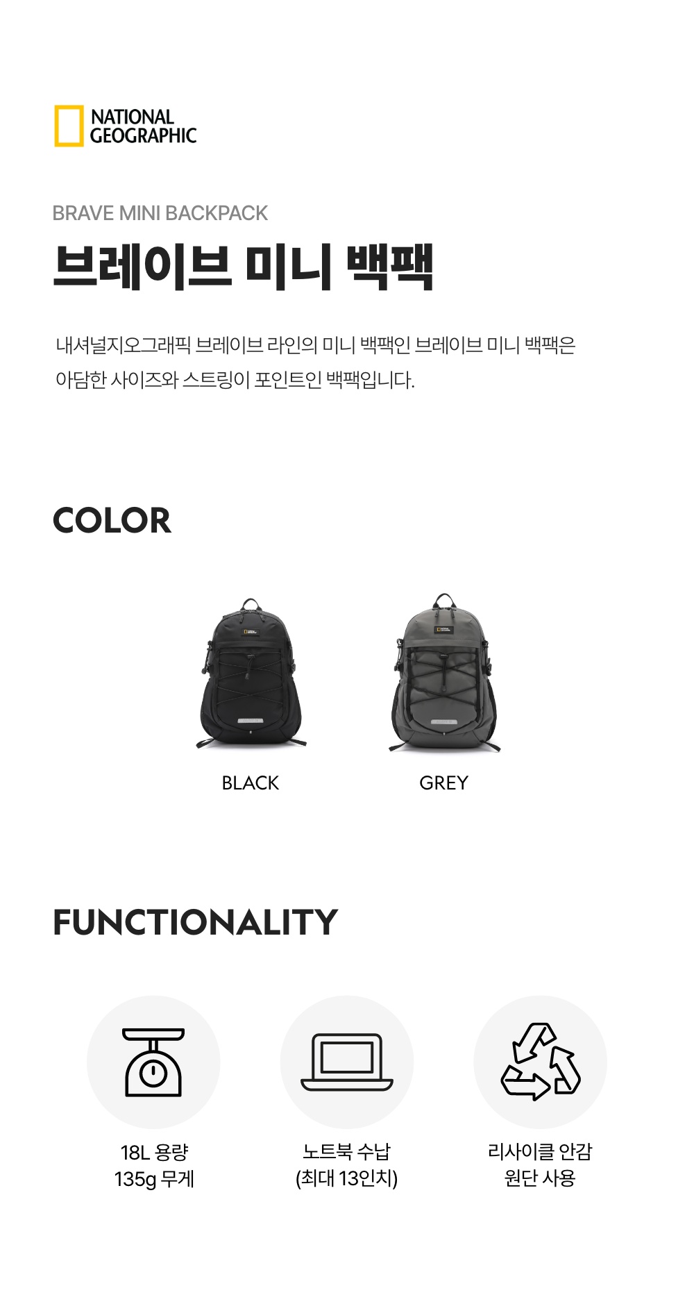 내셔널지오그래픽 브레이브 미니 백팩 그레이