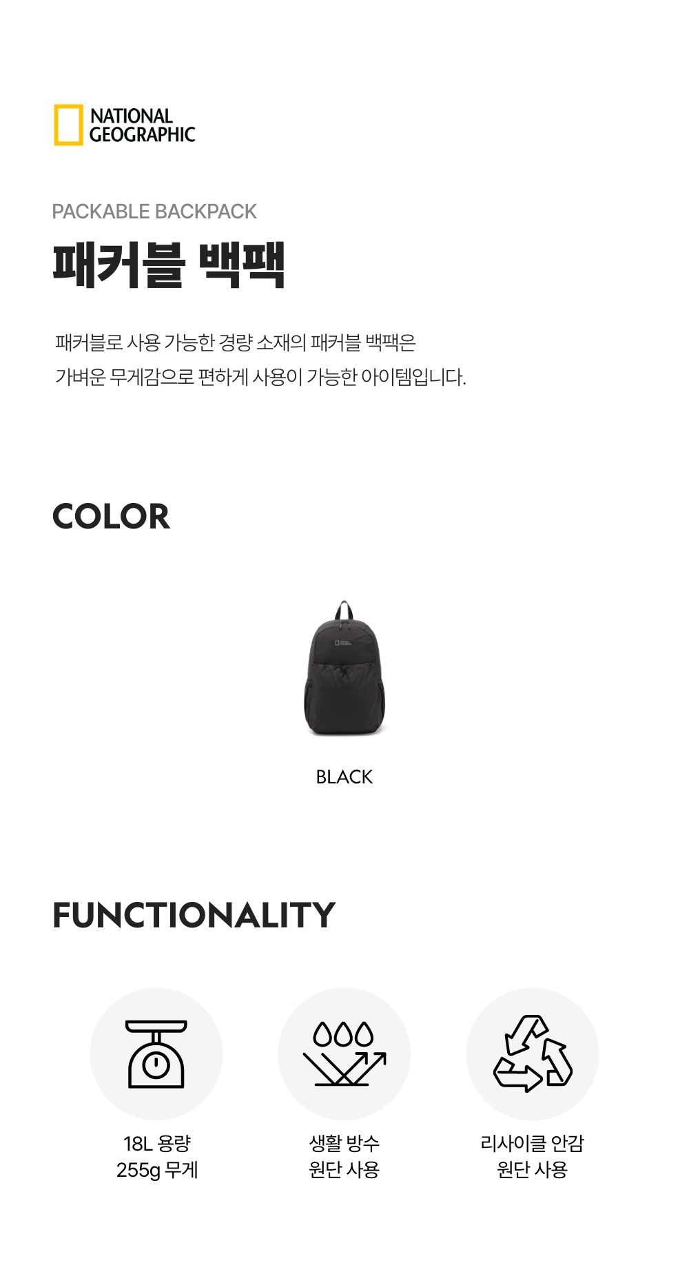 내셔널지오그래픽 패커블 백팩 블랙