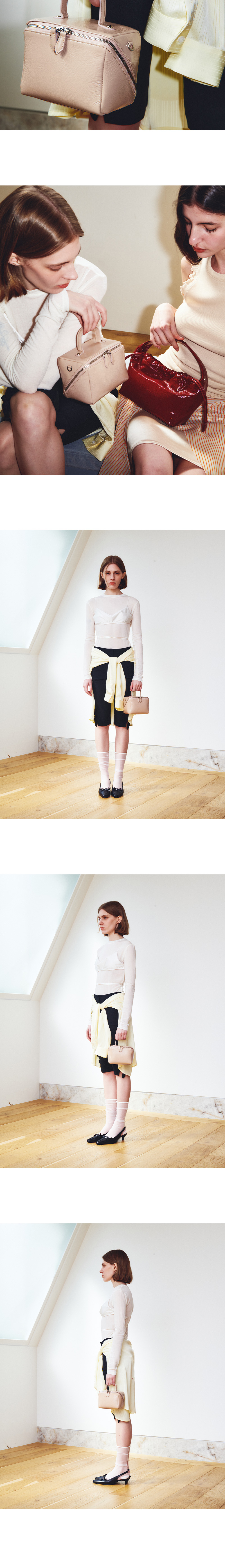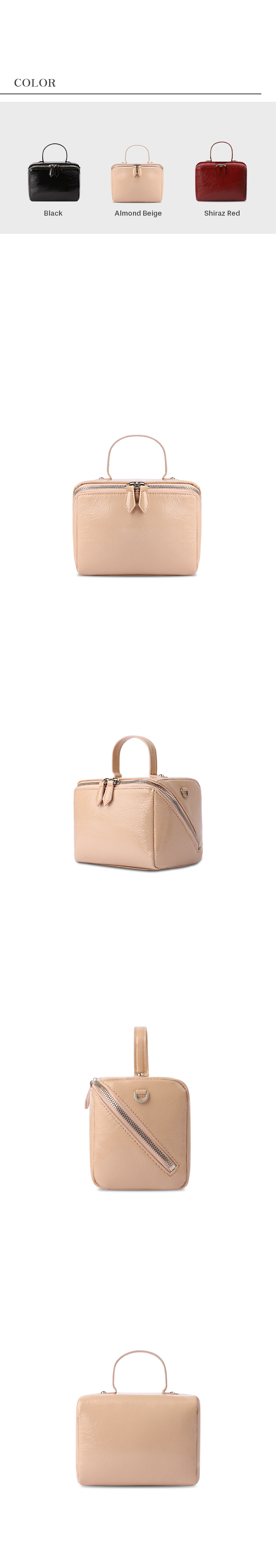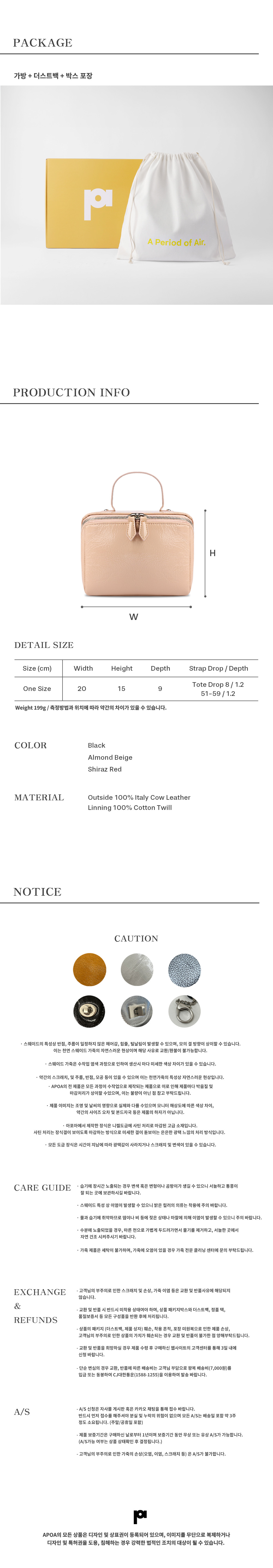 서클형 핸들과 사각 형태의 쉐입이 매력적인 보카 큐브 백입니다. 링클 페이던트 타입의 이태리 카우 레더로 제작된 가방으로 불규칙한 주름과 고급스러운 광택이 매력적인 가방입니다. 직사각형 형태로 제작되어 공간 활용도가 높고, 견고한 쉐입이 특징인 백으로 대각선으로 절개된 여닫이 디테일을 추가하였습니다. 핸들 또는 별도로 제공되는 스트랩을 활용해 토트, 숄더, 크로스백 등 다양한 연출이 가능합니다. 구성 : Bocca cube bag + Leather Strap