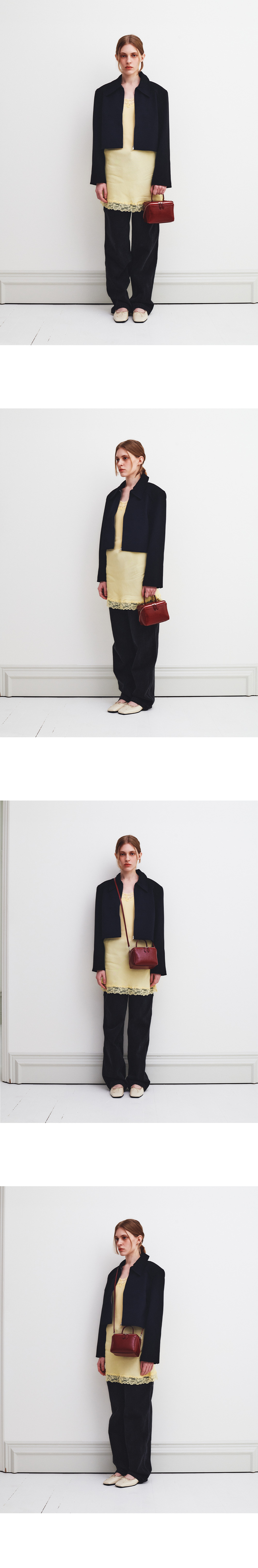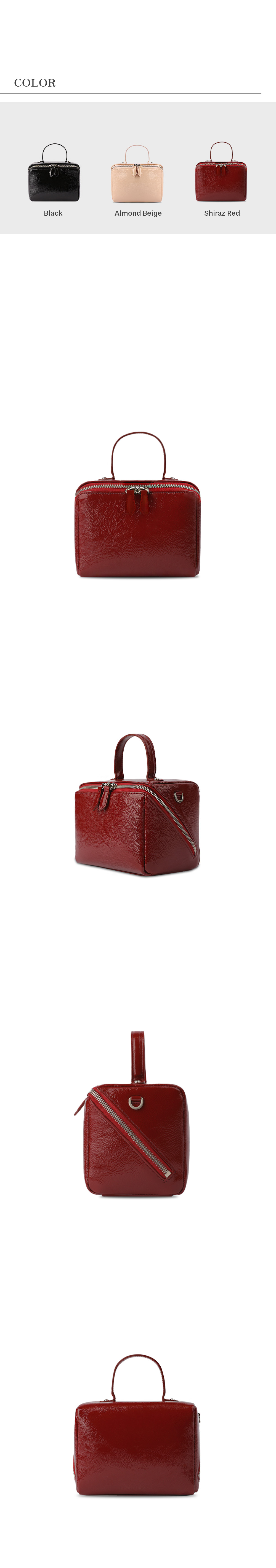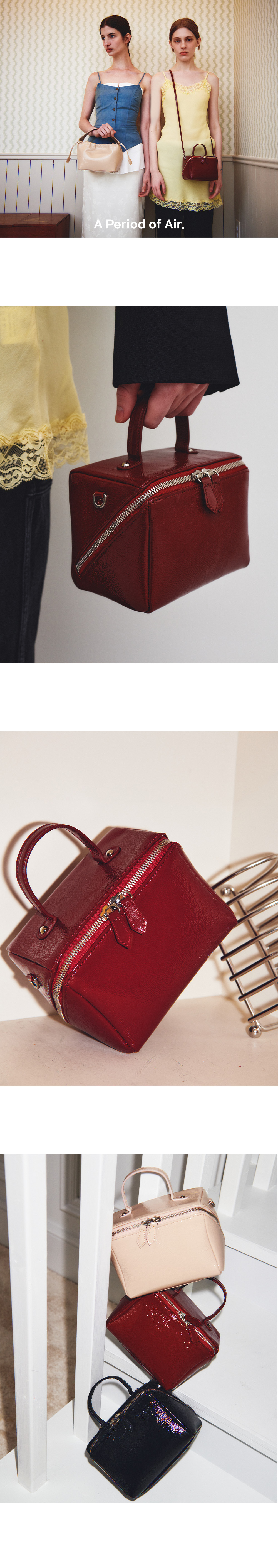 서클형 핸들과 사각 형태의 쉐입이 매력적인 보카 큐브 백입니다. 링클 페이던트 타입의 이태리 카우 레더로 제작된 가방으로 불규칙한 주름과 고급스러운 광택이 매력적인 가방입니다. 직사각형 형태로 제작되어 공간 활용도가 높고, 견고한 쉐입이 특징인 백으로 대각선으로 절개된 여닫이 디테일을 추가하였습니다. 핸들 또는 별도로 제공되는 스트랩을 활용해 토트, 숄더, 크로스백 등 다양한 연출이 가능합니다. 구성 : Bocca cube bag + Leather Strap