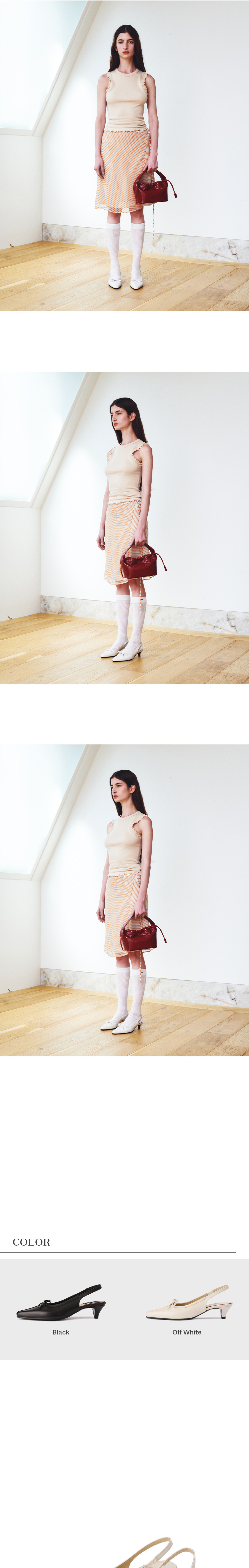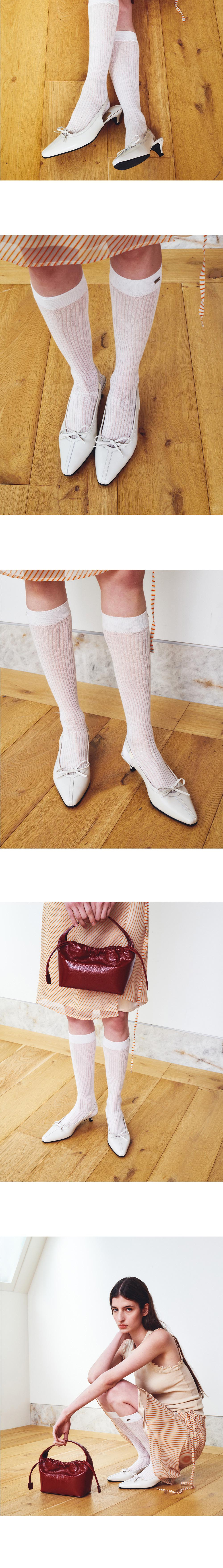앞 코가 길게 떨어지는 라스트의 우아한 실루엣이 특징인 피오코 슬링백 펌프스입니다. 고급스러운 광택의 이태리 카우 레더를 사용하였고 발등의 리본 디테일과 Y 패치 디자인을 활용한 매력적인 슈즈입니다. 슬링백 디자인으로 핏이 안정적이며, 편안한 착화감을 위해 매트리스 폼을 사용하였습니다.