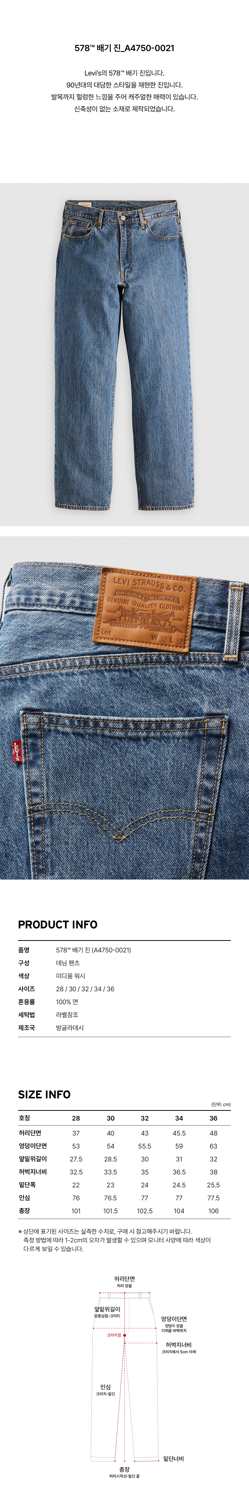 Levi's의 578™ 배기 진입니다. 90년대의 대담한 스타일을 재현한 진입니다. 발목까지 헐렁한 느낌을 주어 캐주얼한 매력이 있습니다. 신축성이 없는 소재로 제작되었습니다.