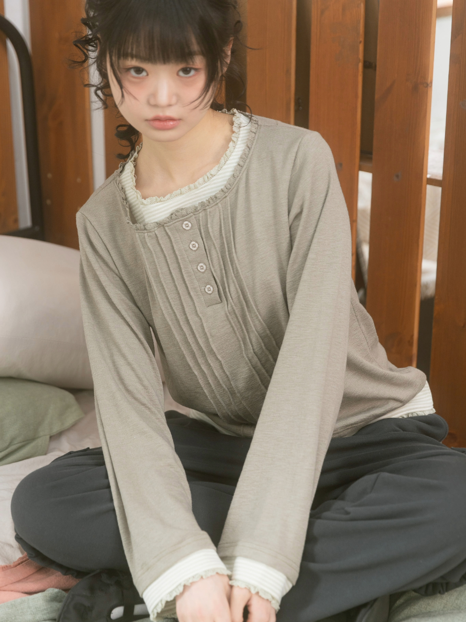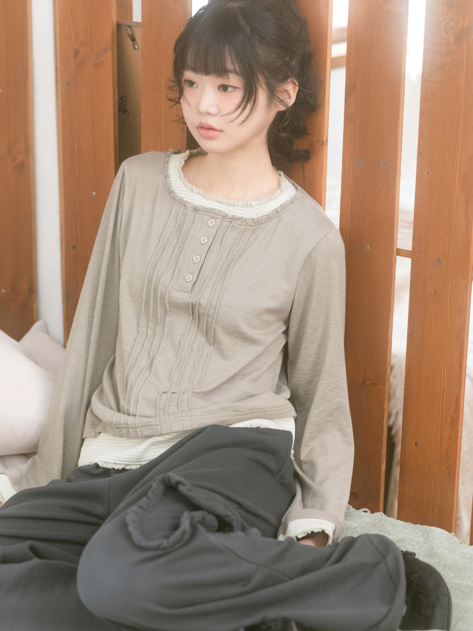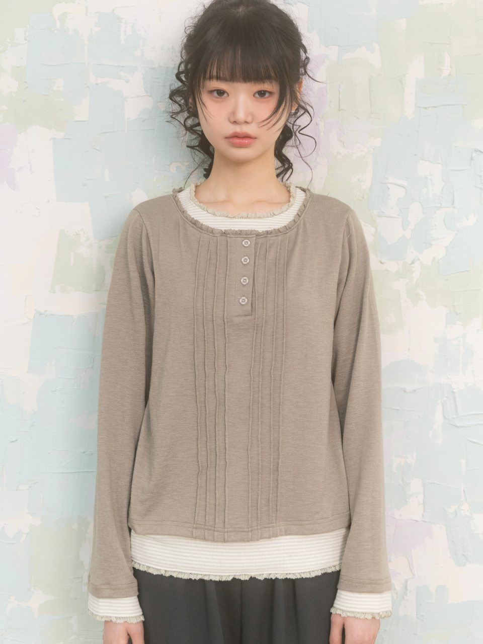 Vintage Layered Henley Neck Long Sleeve 빈티지 레이어드 헨리넥 롱슬리브 빈티지 스타일의 단가라 레이어드 롱슬리브 러블리한 레이스와 꽃 단추 헨리넥 포인트 부드럽고 가벼운 소재로 편안하게 착용가능 Color: Ivory / Khaki sizw : free