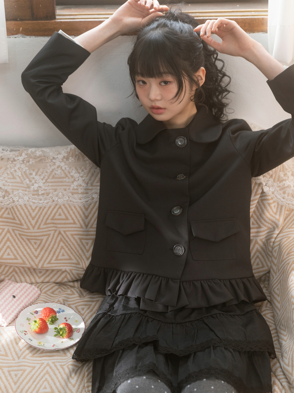 Dot Button Frill Jacket 도트 버튼 프릴 자켓 러블리 클래식 무드의 세미 크롭핏 프릴 자켓 포인트 있는 빅 도트 버튼과 카라 디자인 스커트, 팬츠 등 다양한 하의류와 매치 가능 Color: Charcoal Size: Free (One Size)