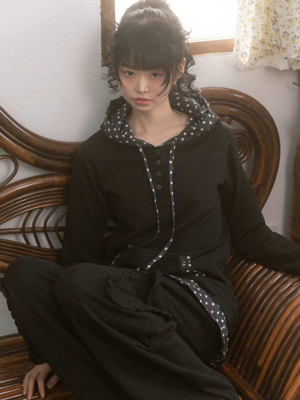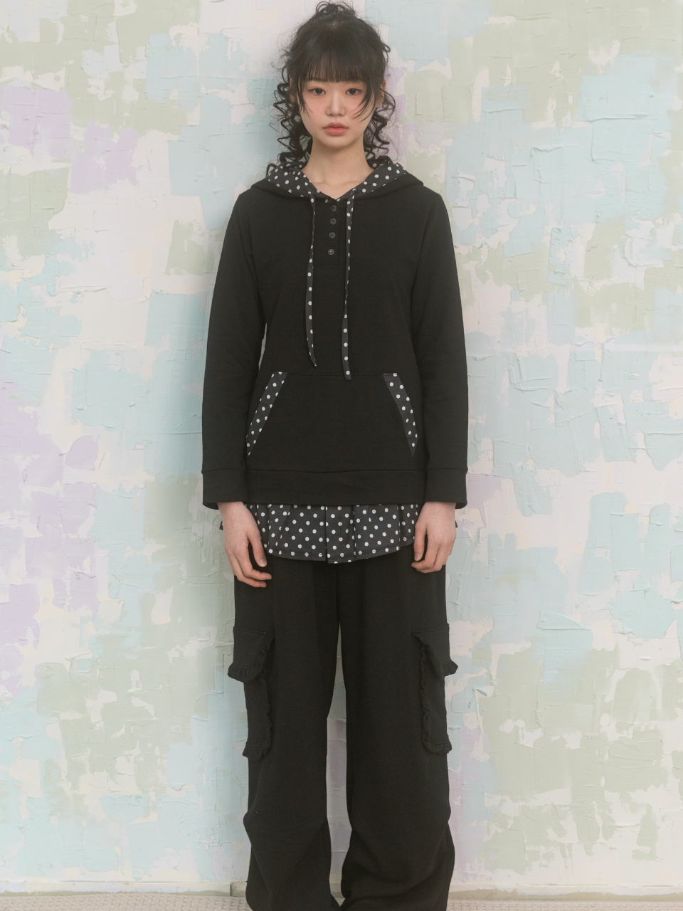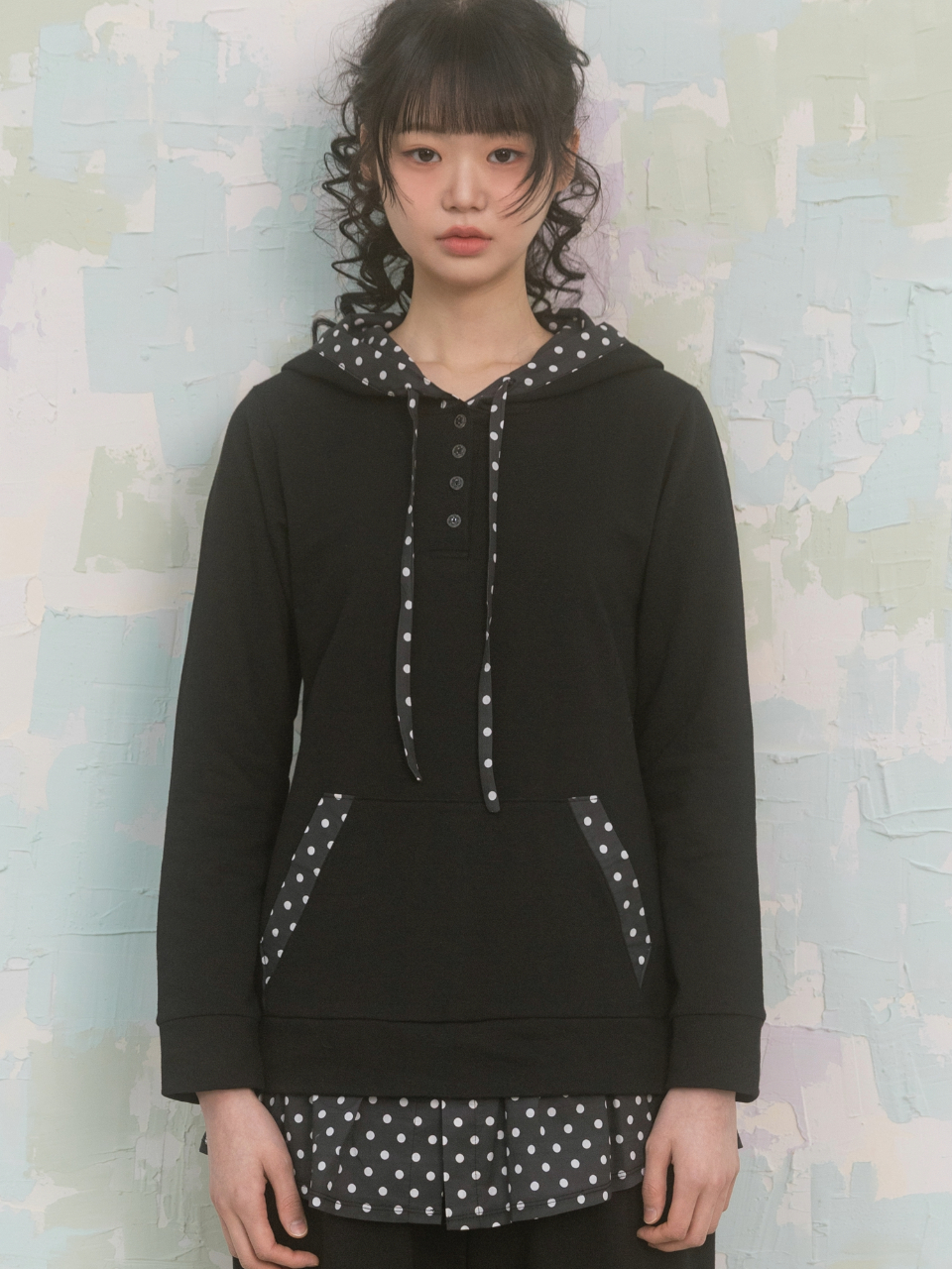 나이엔 도트 헨리넥 후드 롱슬리브 블랙