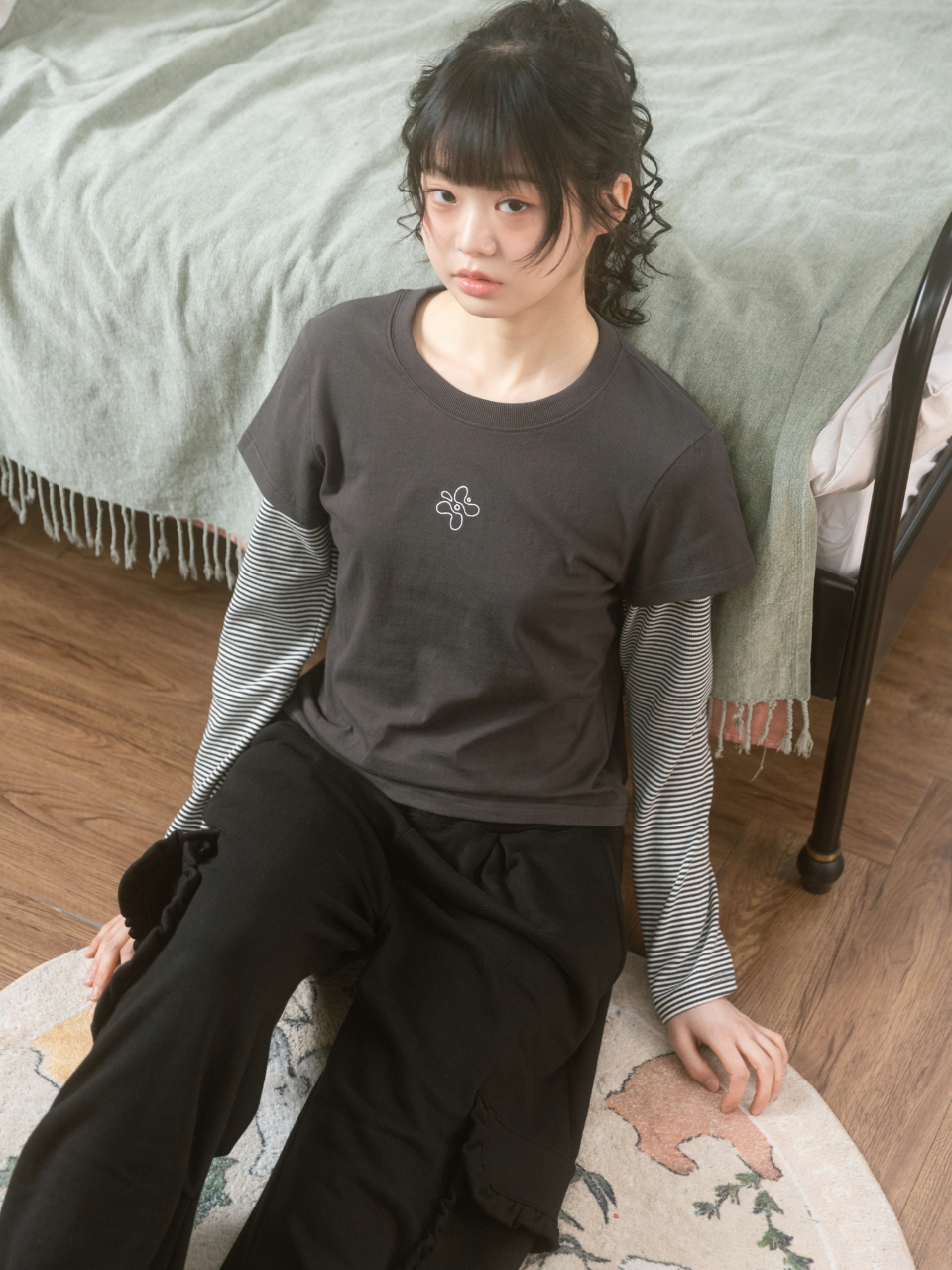Logo Layered Long Sleeve 로고 레이어드 롱슬리브 빈티지 스타일의 단가라 배색 롱슬리브 앞 정면에 시그니처 로고 자수 포인트 부드러운 소재로 편하게 착용가능 Color: Charcoal Size: Free (One Size)