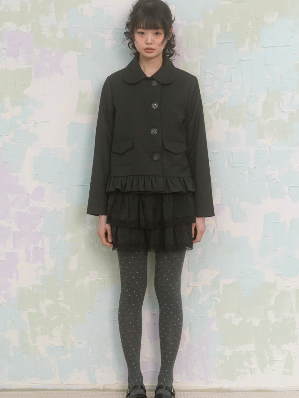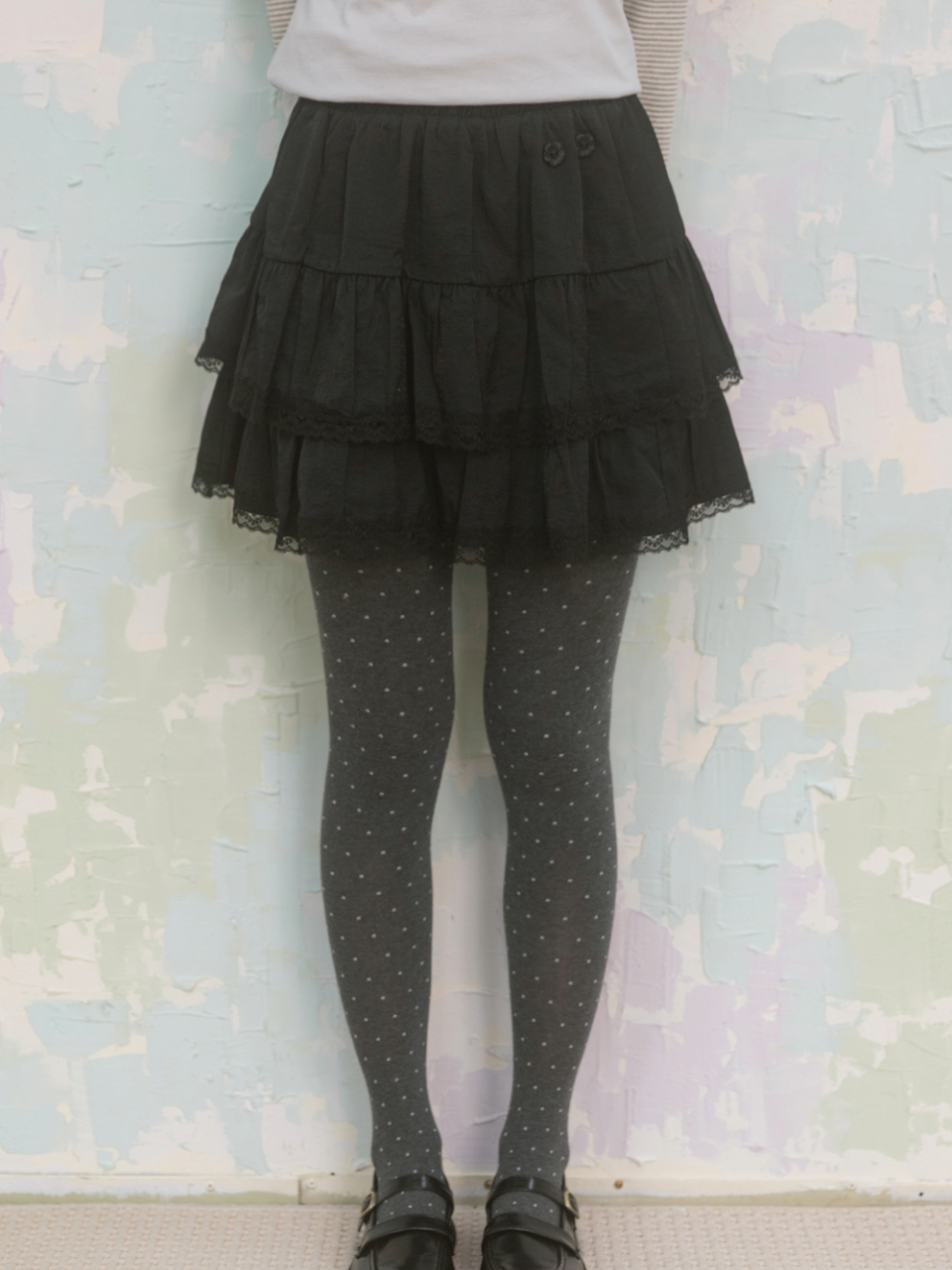 Lace CanCan Mini Skirt 레이스 캉캉 미니 스커트 러블리한 핏의 미니 캉캉 스커트 앞 상단에 플라워 버튼, 밑단 레이스 포인트 팬츠, 스타킹 등과 레이어드 연출가능 Color: Black Size: Free (One Size)