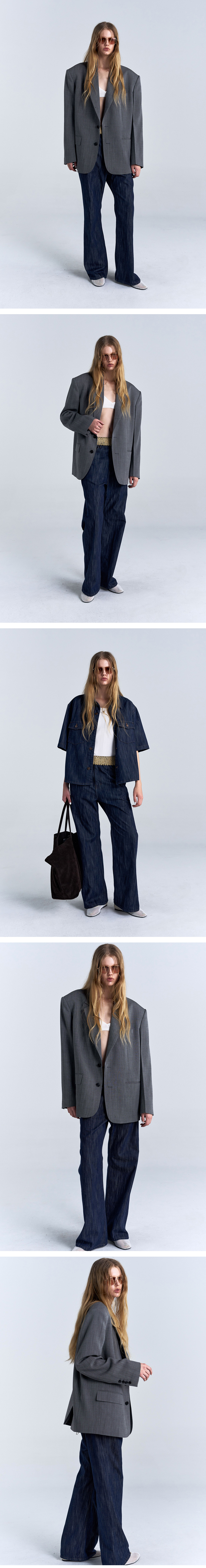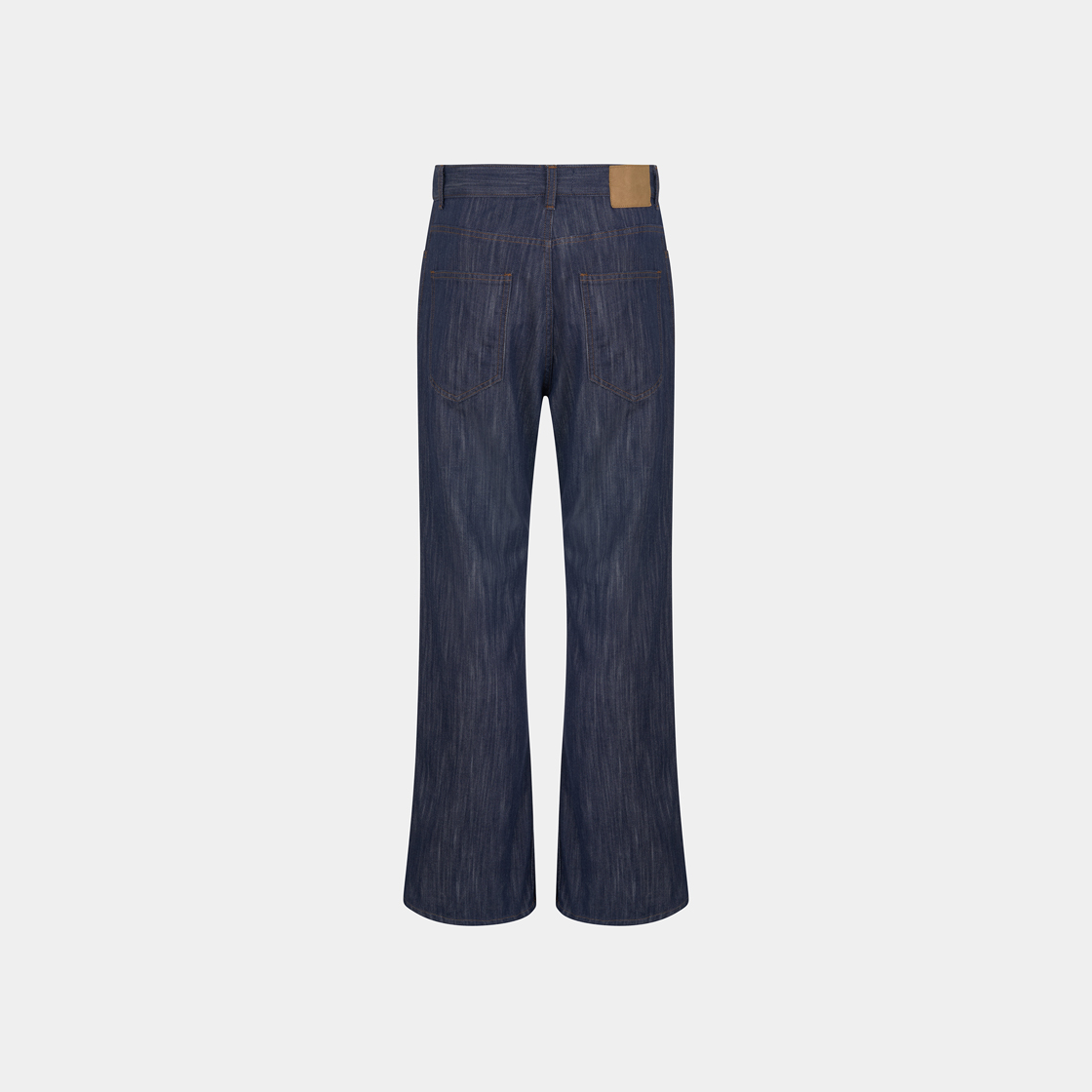 탄탄한 조직감의 인디고 플레어 팬츠입니다. 정교하게 잡힌 주름 디테일이 포인트입니다.
