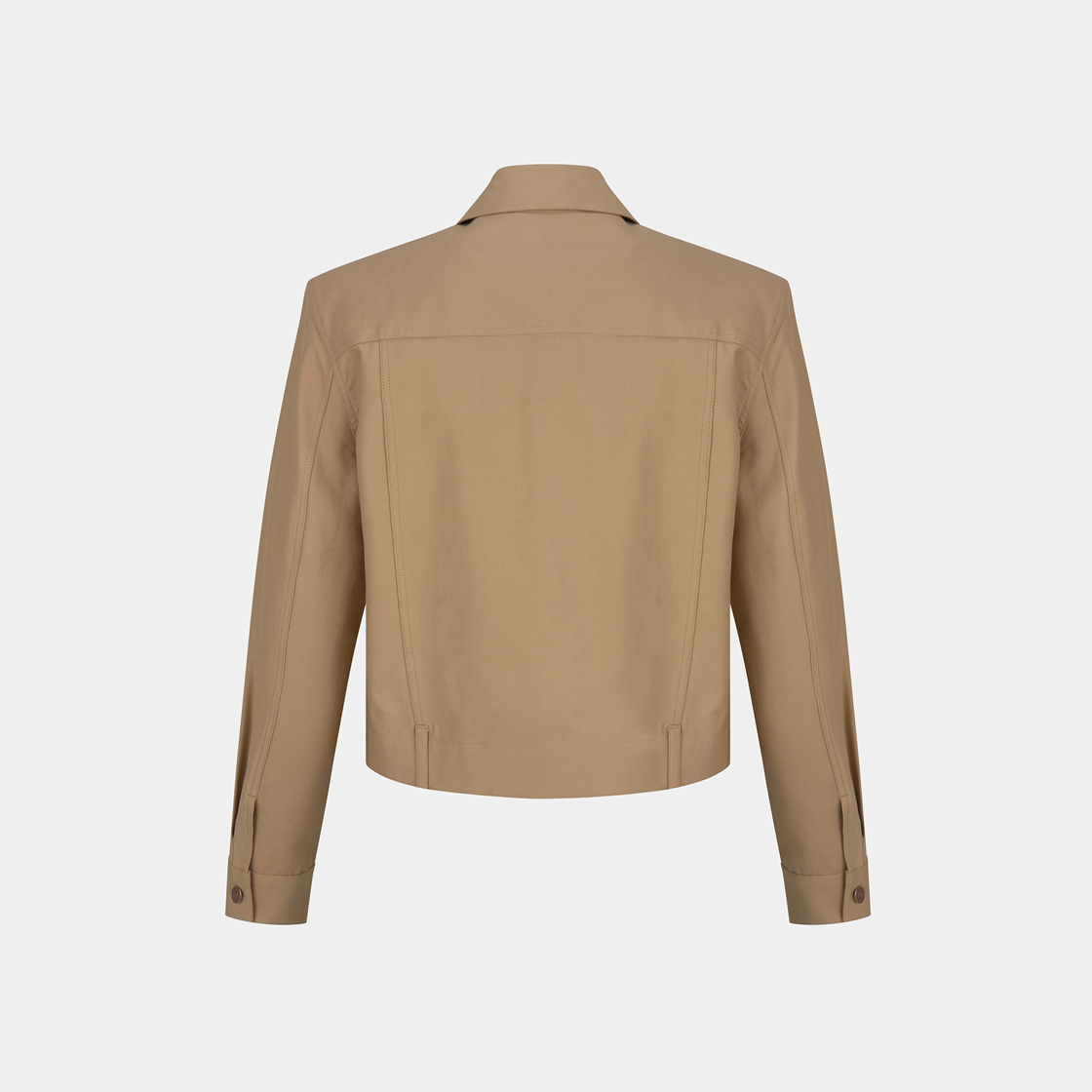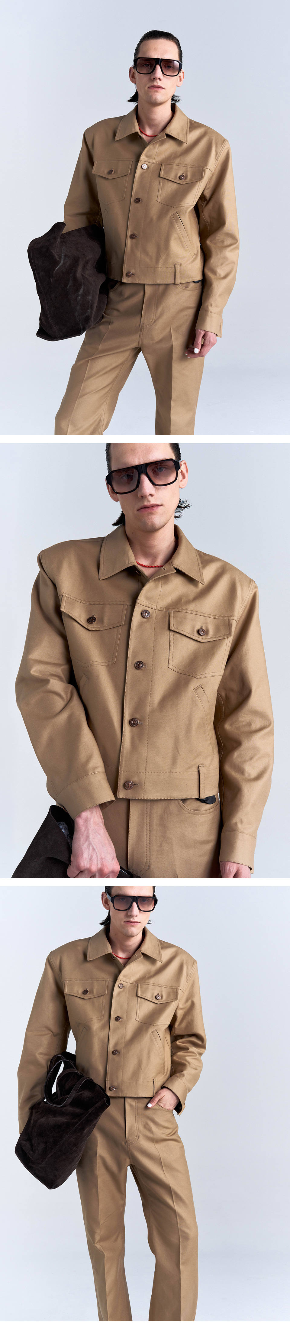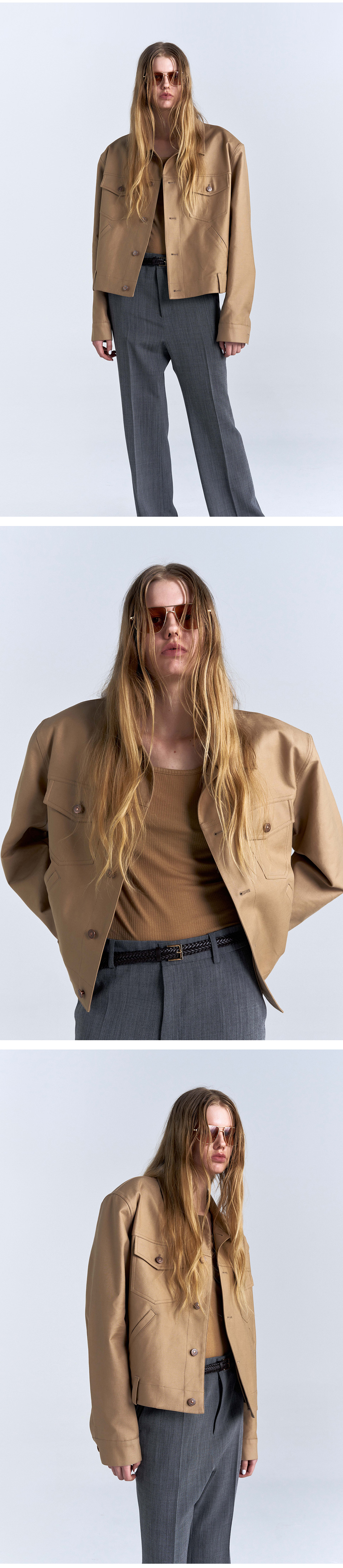탄탄한 코튼 소재로 제작된 트러커 워크 자켓입니다. 크롭 기장과 구조적인 어깨 실루엣이 특징이며, "TRUCKER FLARED PANTS"와 셋업 연출이 가능합니다.