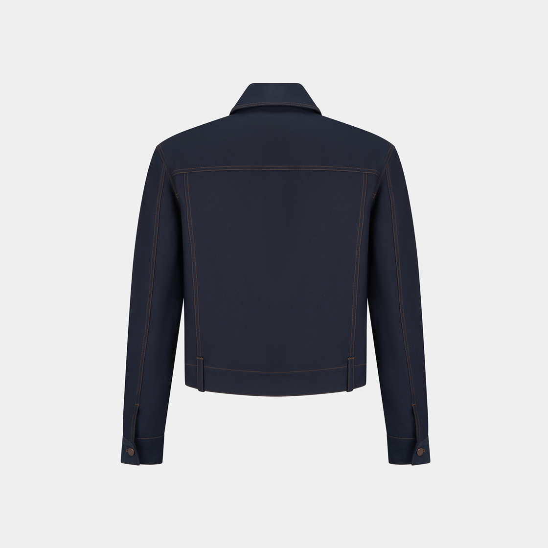 탄탄한 코튼 소재로 제작된 트러커 워크 자켓입니다. 크롭 기장과 구조적인 어깨 실루엣이 특징이며, "TRUCKER FLARED PANTS"와 셋업 연출이 가능합니다.
