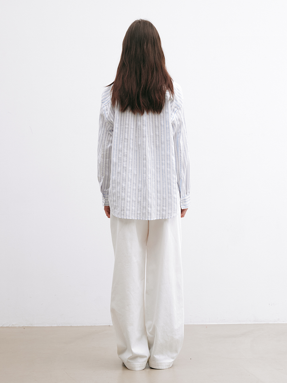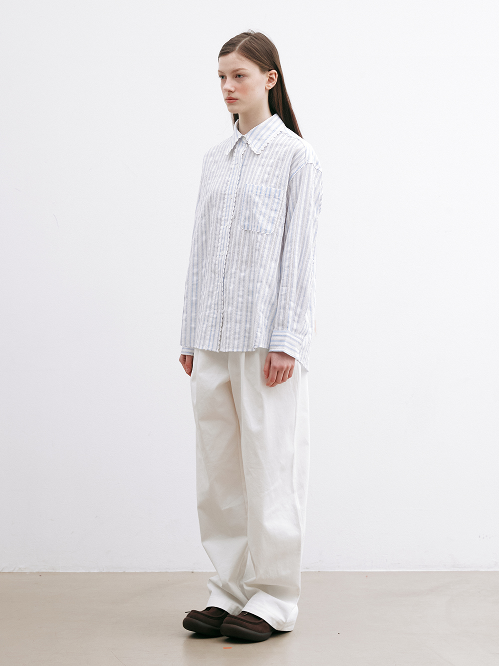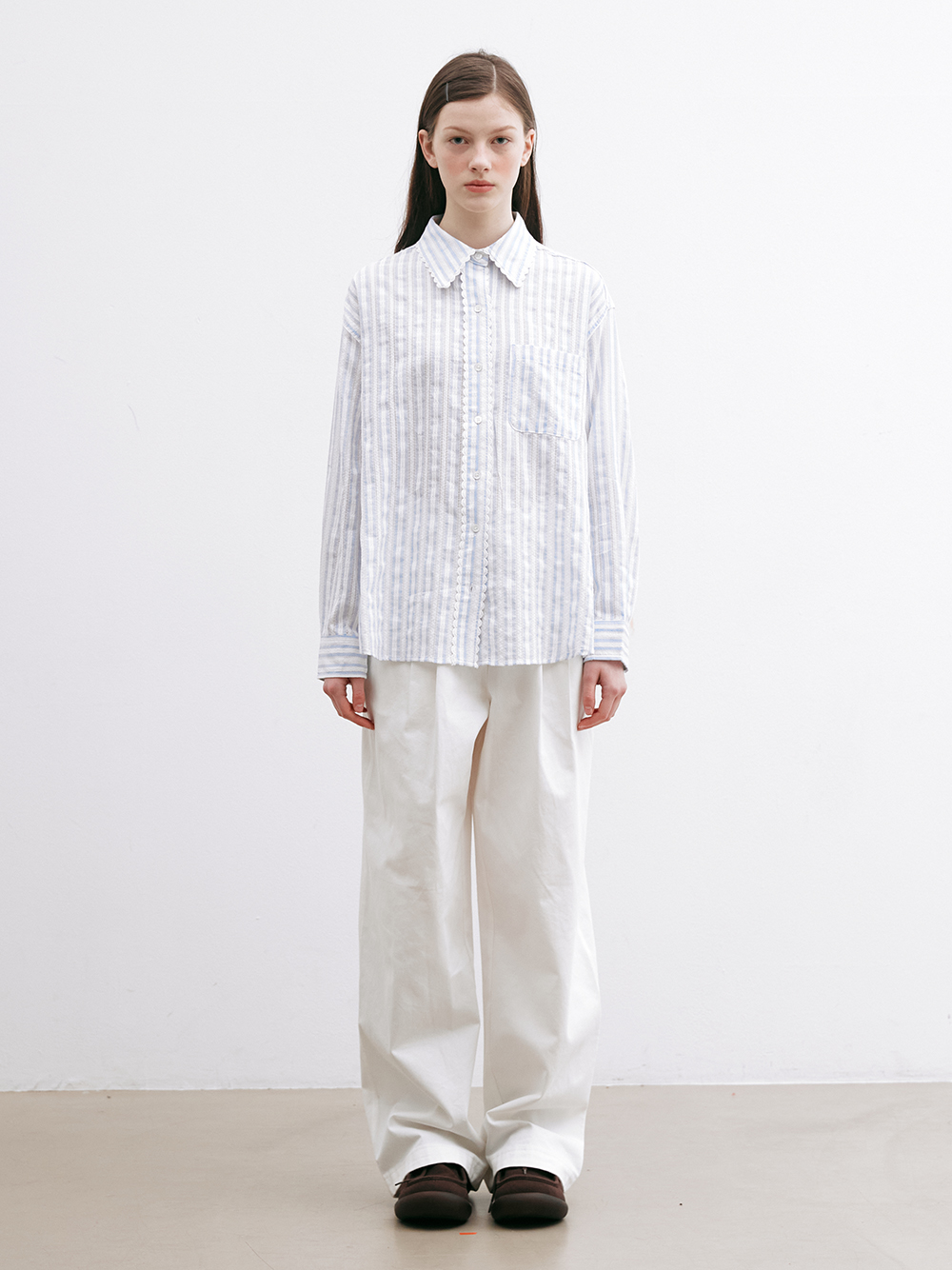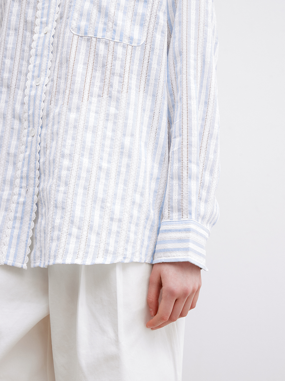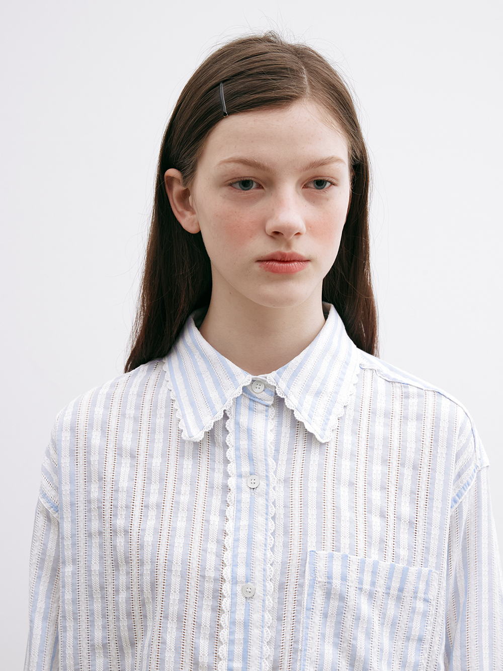 2025 SPRING COLLECTION - 레이스 형식의 짜임의 스트라이프 원단 - 전면, 카라부분의 레이스 트리밍 디테일 - 전면, 소매의 천연 자개단추 (무광가공) - Made in korea +COLOR BLUE +CARE Dry cleaning +MODEL SIZE 172cm Model(Female) wears size Free