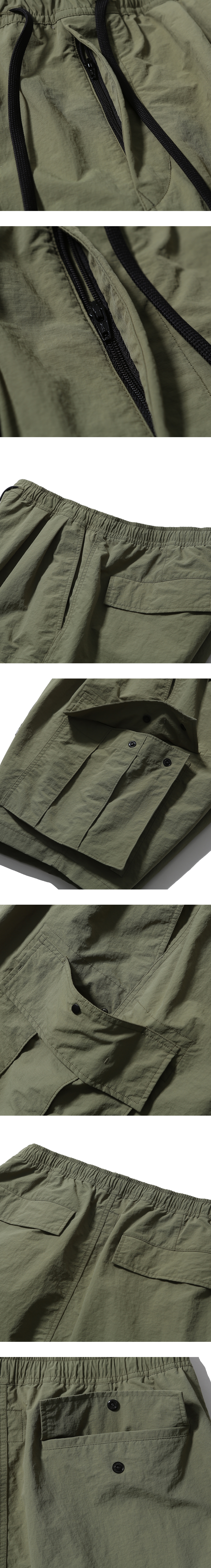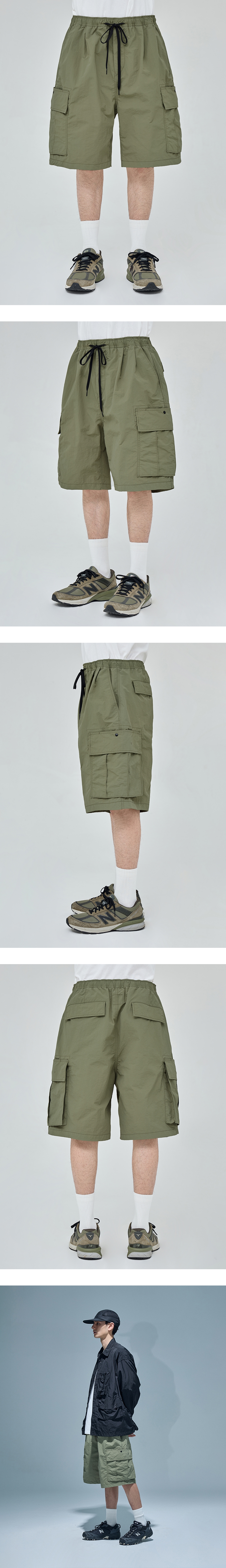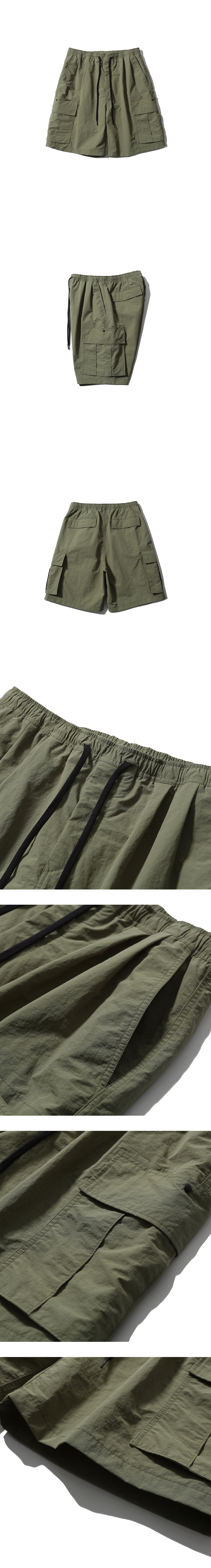 넉넉한 수납공간을 갖춘 밀리터리 쇼츠 · 여유롭고 편안한 느낌의 실루엣. · 고밀도의 묵직한 립스탑 나일론 원단 사용. · 넉넉한 사이즈의 카고 포켓을 포함한 6개의 포켓으로 구성. · 플랩을 열지 않고도 활용이 가능한 카고 포켓 디테일. · 허리에 턱을 넣어 편안한 착용감과 풍성한 실루엣 연출. · 신축성 있는 내장형 이밴드에 조임용 스트링이 달린 허리 사양.