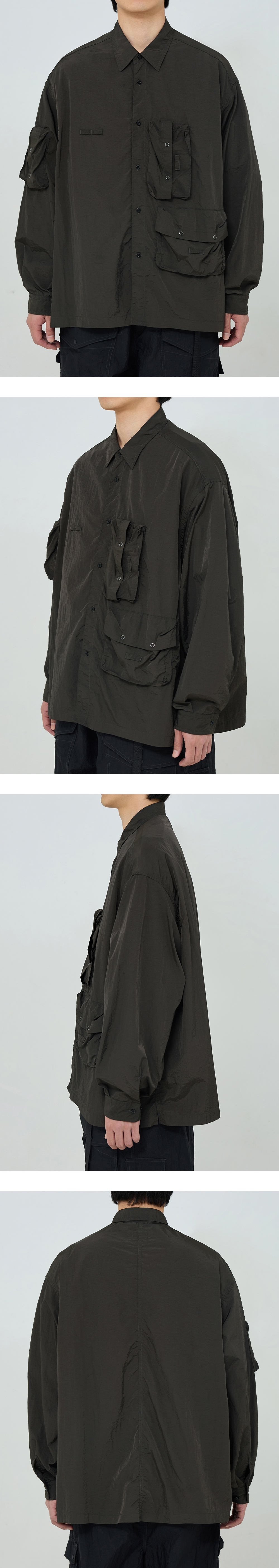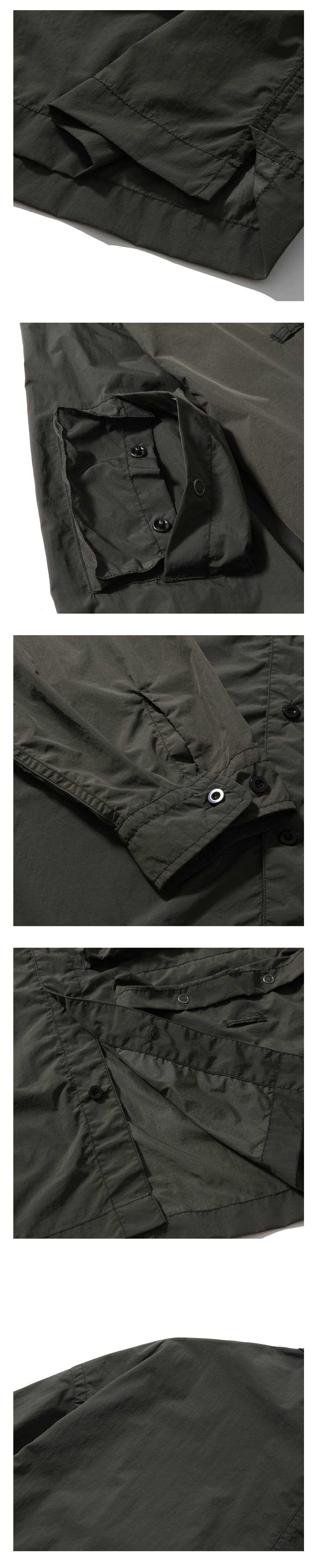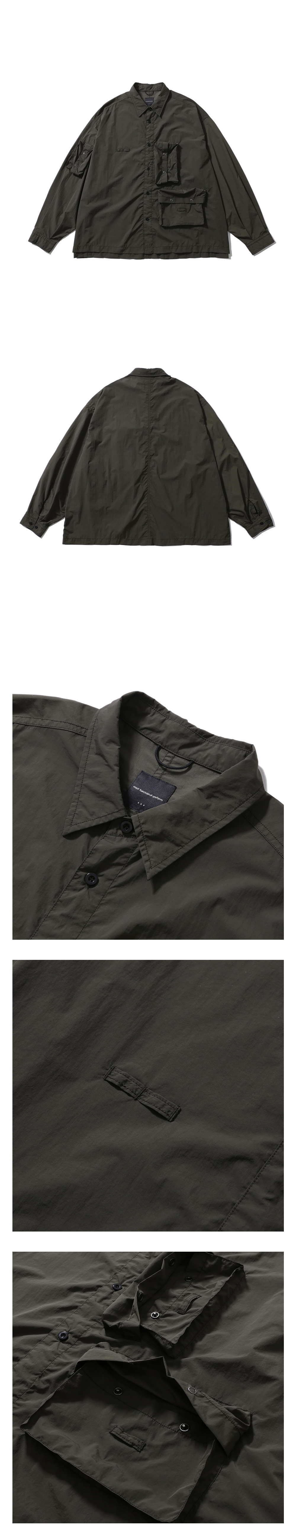 밀리터리 무드의 주머니가 매력적인 셔츠 재킷 · 여유 있고 오버한 실루엣. · 얇고 바스락거리는 나일론 원단 사용. · 단추를 사용한 앞여밈 사양. · 스냅 여밈의 다양한 사이즈의 멀티 포켓. · 가벼운 무게와 넉넉한 실루엣으로 간편하게 레이어링 가능.