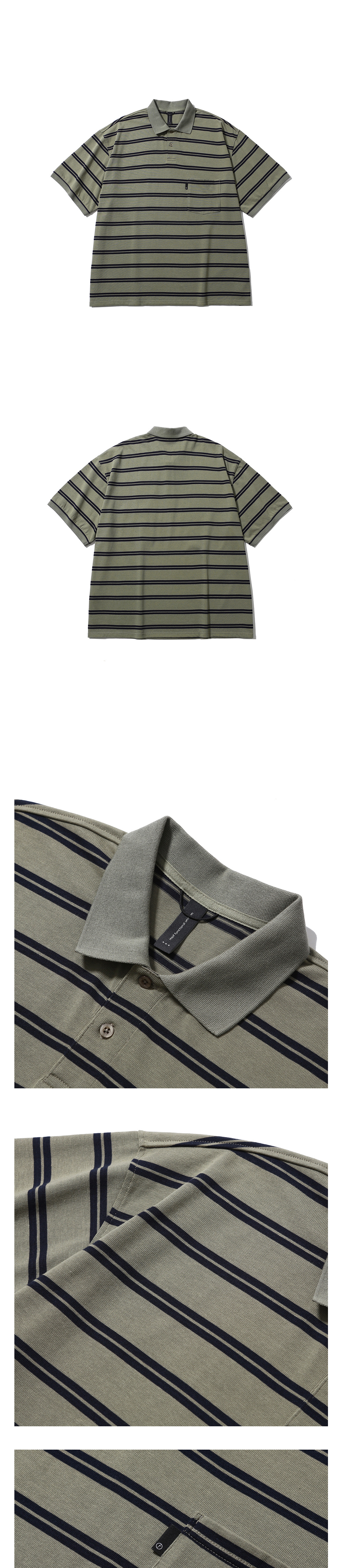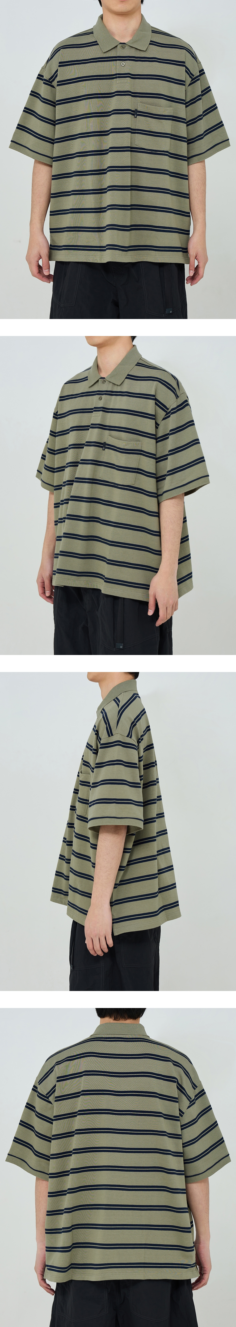 와이드 한 실루엣의 반팔 폴로 셔츠 · 와이드 한 오버사이즈 실루엣. · 접이식 카라와 3버튼 여밈의 클래식한 폴로 셔츠. · 스트라이프 피케 원단 사용. · 수축 방지 가공된 원단으로 세탁 후에도 변형이 적음. · 간단한 소지품을 수납할 수 있는 가슴 주머니. · 옆트임의 시그니처 테이프 디테일. · 주머니 부분 모이프 심볼 포인트 라벨 부착.