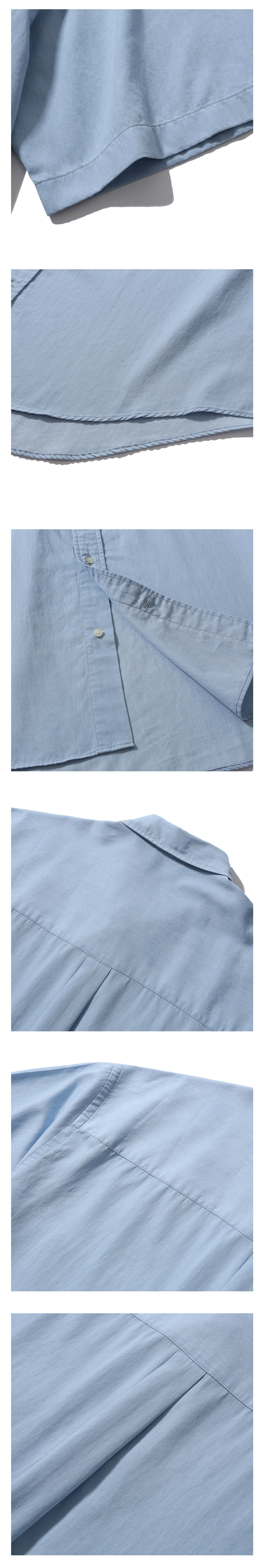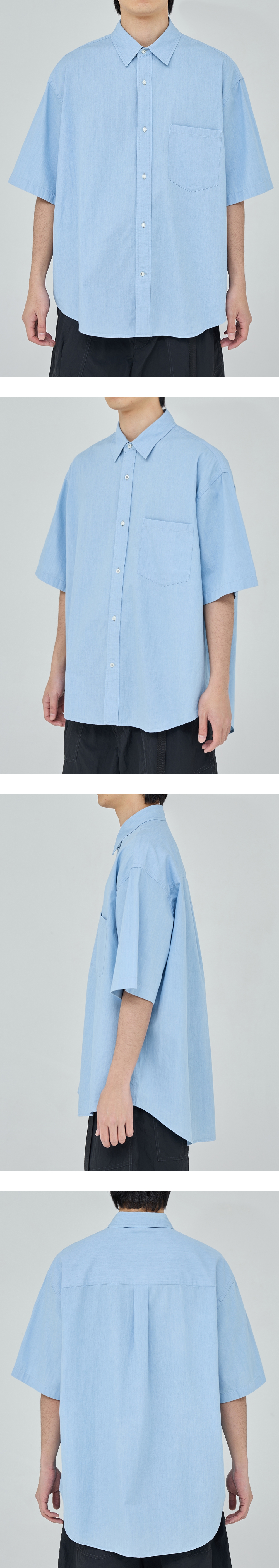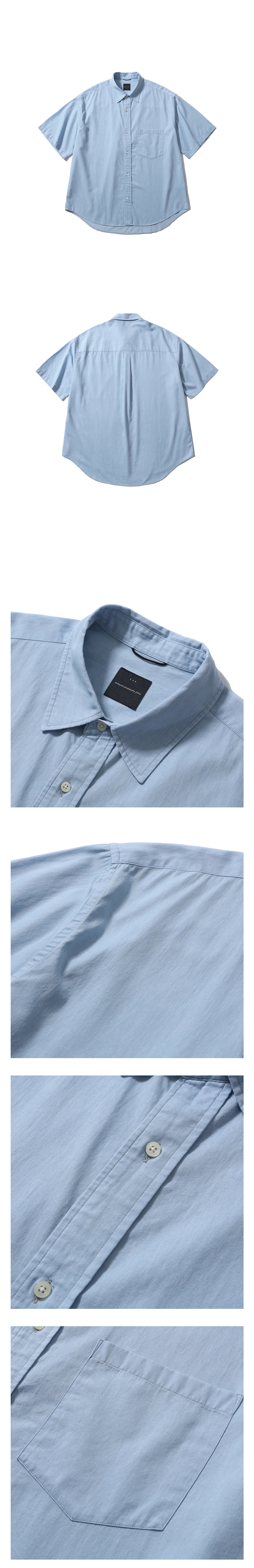 모이프의 기본 유니폼 반팔 셔츠 · 여유 있는 오버사이즈 실루엣. · 고밀도의 바이오 워싱 처리한 면 원단 사용. · 기본에 충실한 셔츠 디테일. · 낮은 칼라 높이로 캐주얼한 분위기 연출.