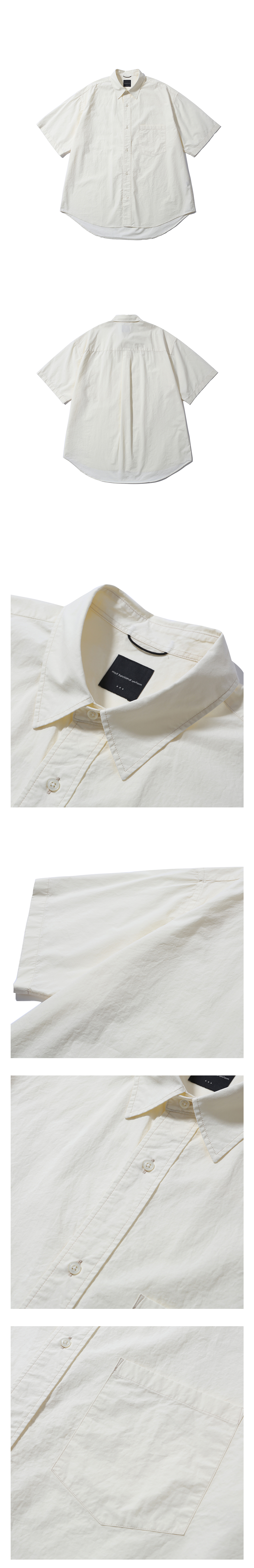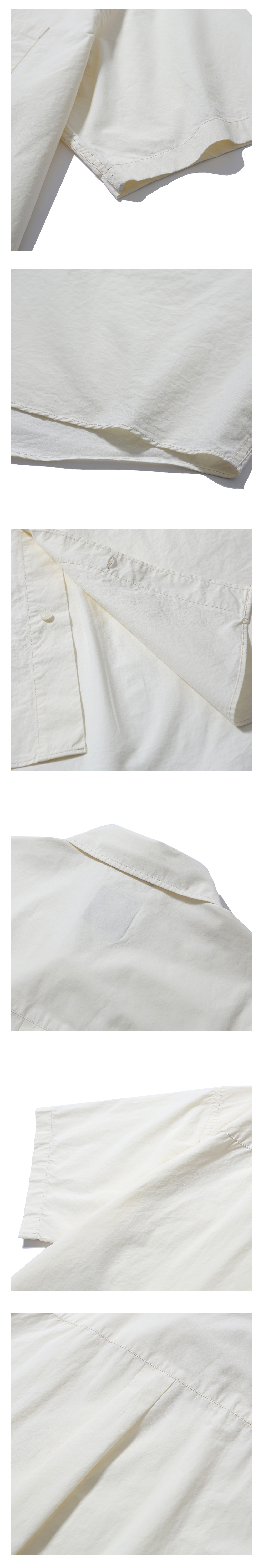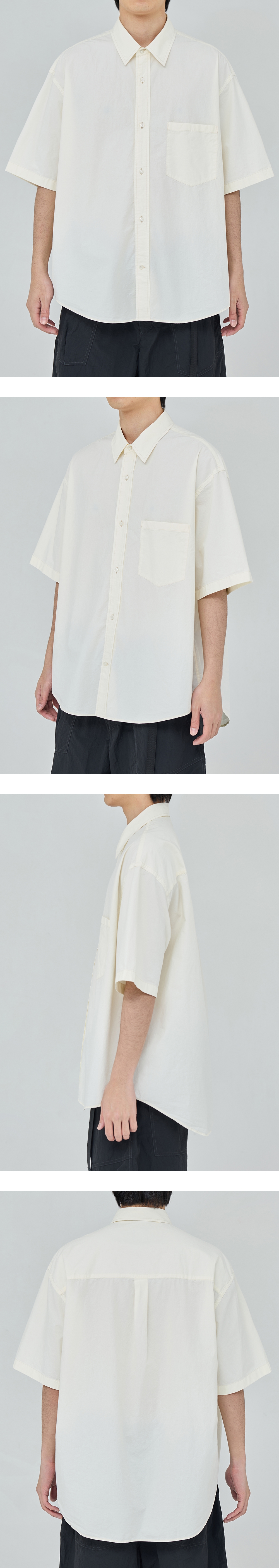 모이프의 기본 유니폼 반팔 셔츠 · 여유 있는 오버사이즈 실루엣. · 고밀도의 바이오 워싱 처리한 면 원단 사용. · 기본에 충실한 셔츠 디테일. · 낮은 칼라 높이로 캐주얼한 분위기 연출.