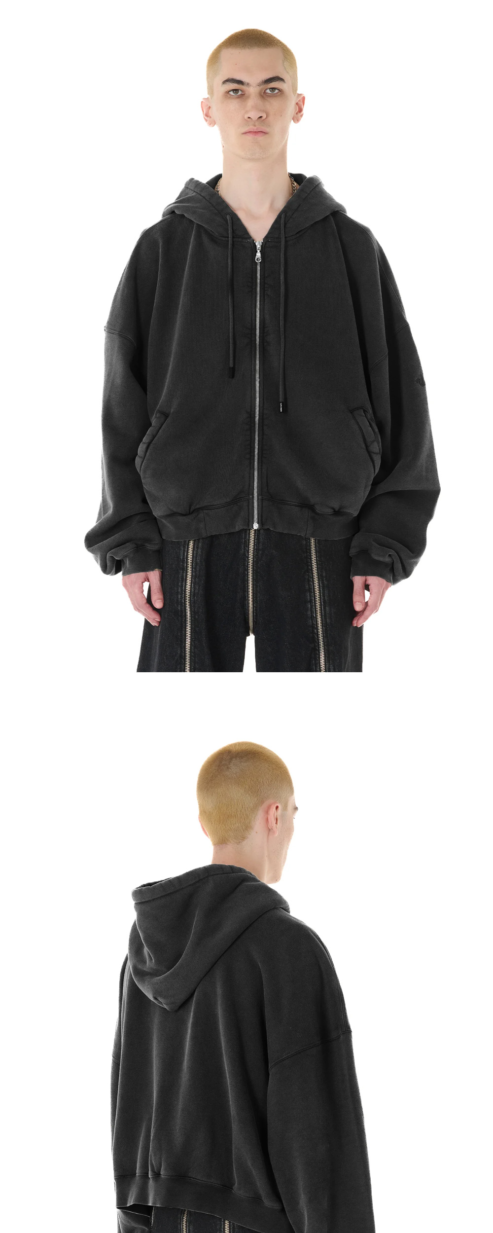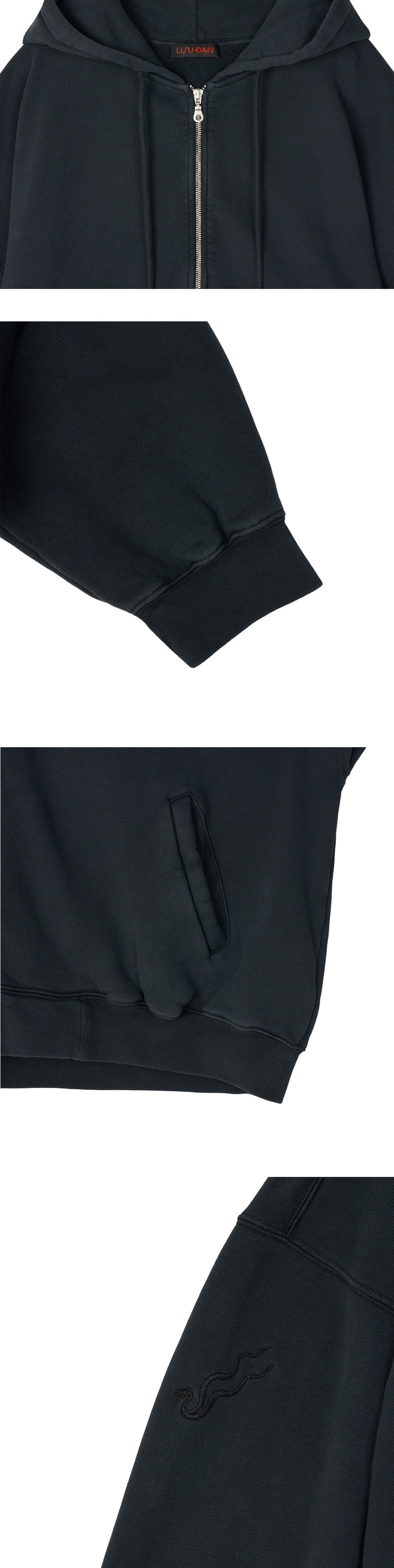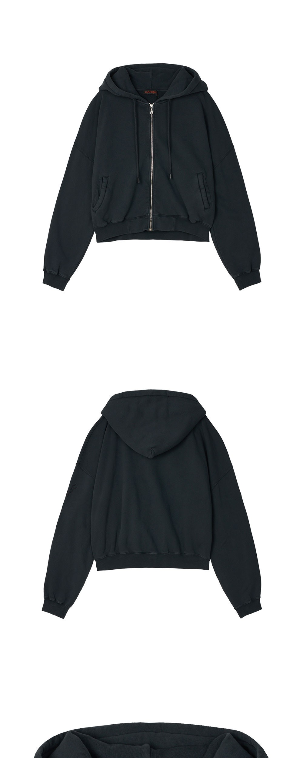 빈티지한 워싱이 돋보이는 LU'UDAN의 Washed Zip Hoodie Overdyed Black입니다. -오버사이즈 핏 -후드 드로스트링 디테일 -드롭 숄더 디자인 -rib-knit 밑단과 소매