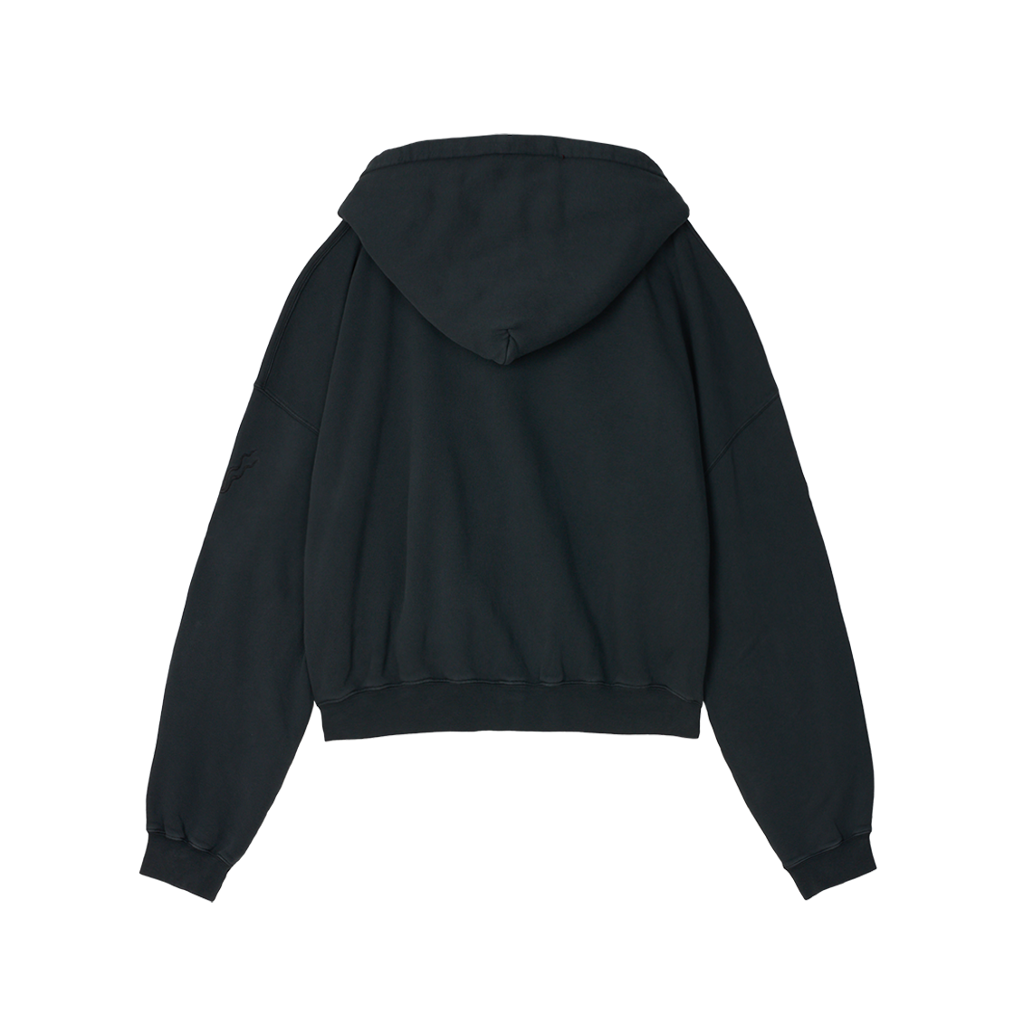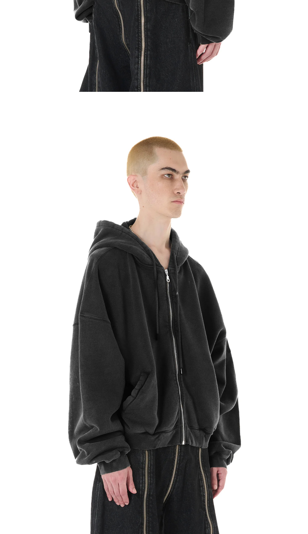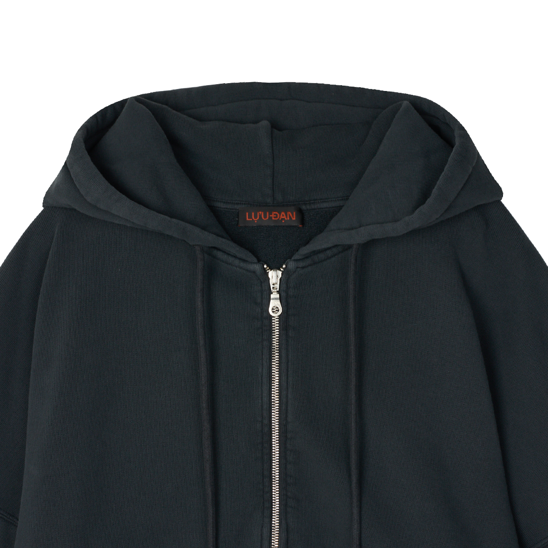 빈티지한 워싱이 돋보이는 LU'UDAN의 Washed Zip Hoodie Overdyed Black입니다. -오버사이즈 핏 -후드 드로스트링 디테일 -드롭 숄더 디자인 -rib-knit 밑단과 소매