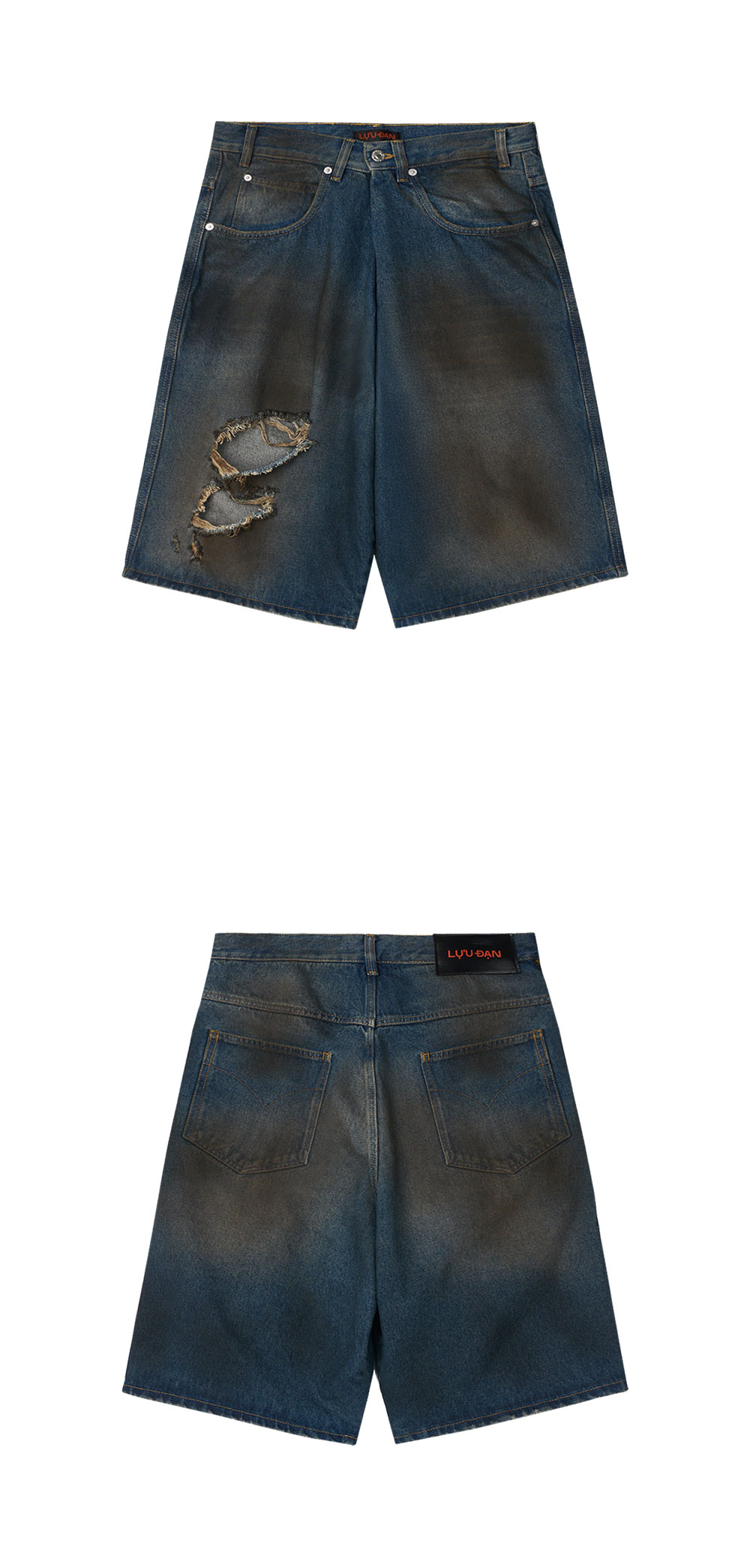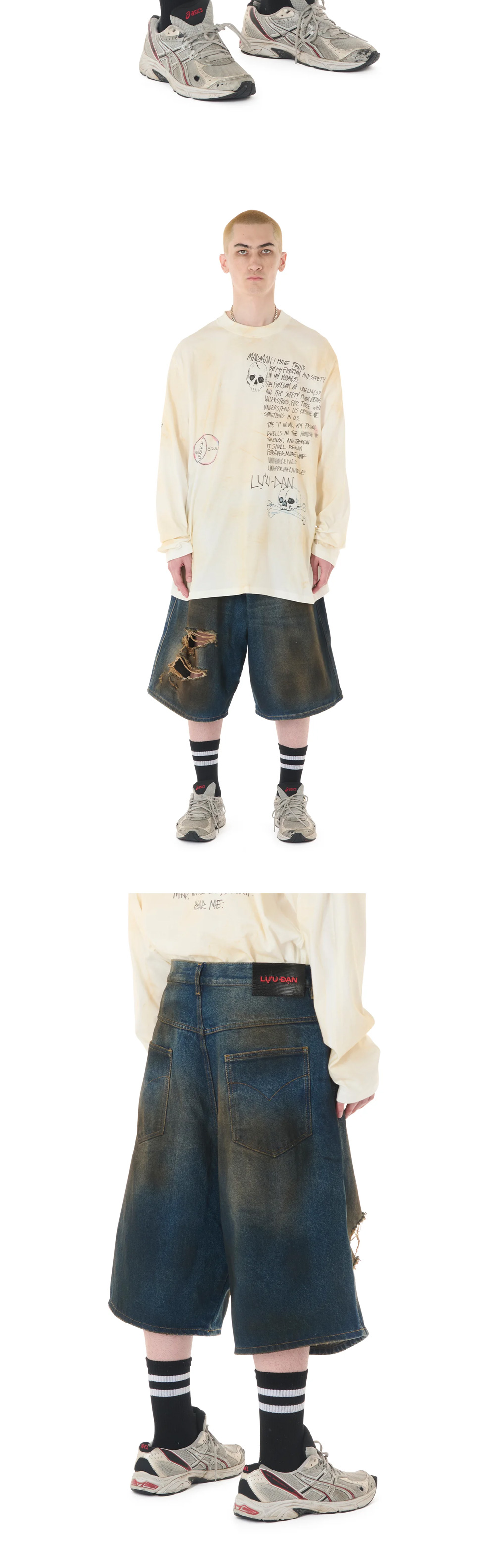 빈티지한 워싱감이 돋보이는 LU'UDAN의 Kriss Kross Shorts Black Vintage Wash입니다. -100% cotton -damaged 디자인 -5 포켓 디자인 -허리의 가죽 로고 패치 디테일