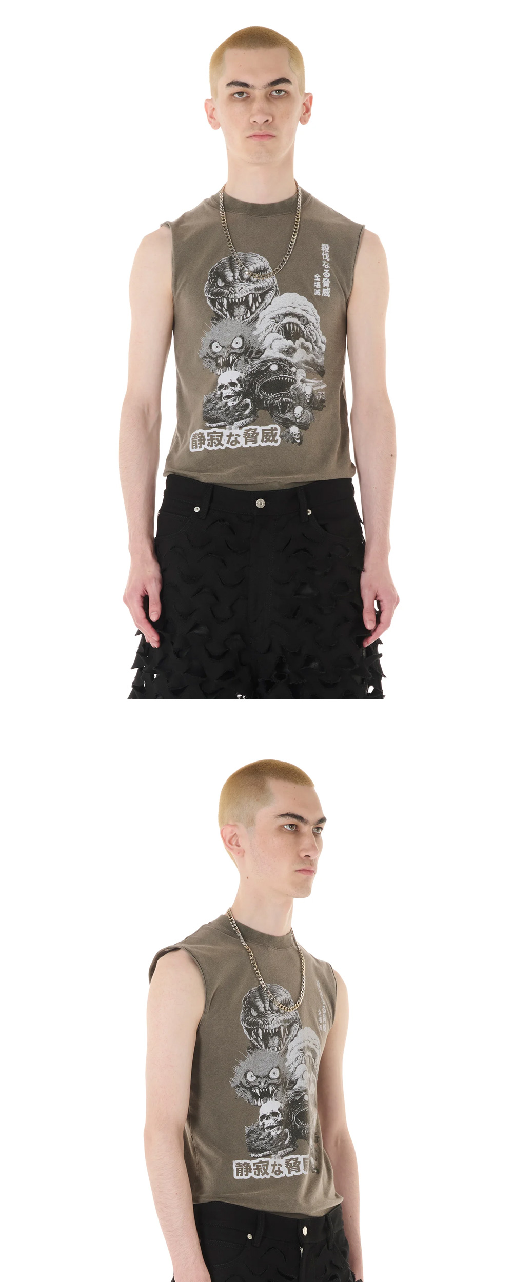 독특한 그래픽으로 펑크 무드가 느껴지는 LU'UDAN의 Sleeveless Tee Washed Black Demon Threat입니다. -전, 후면의 그래픽 및 텍스트 디테일 -raw-edge 소매 -rib-knit 크루넥 디자인