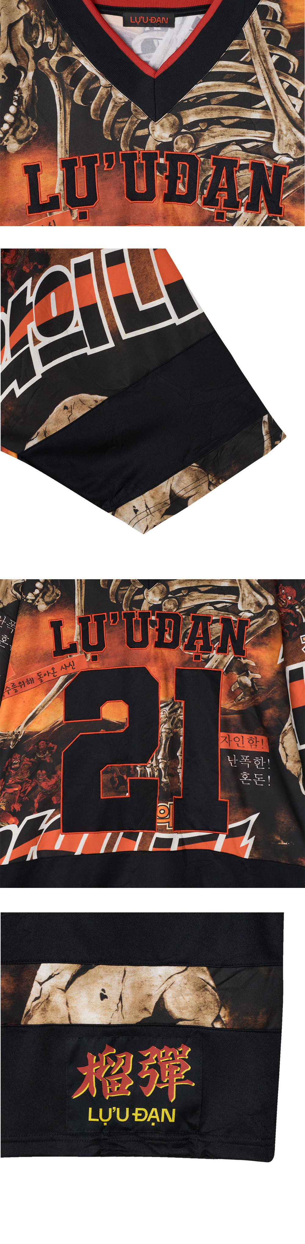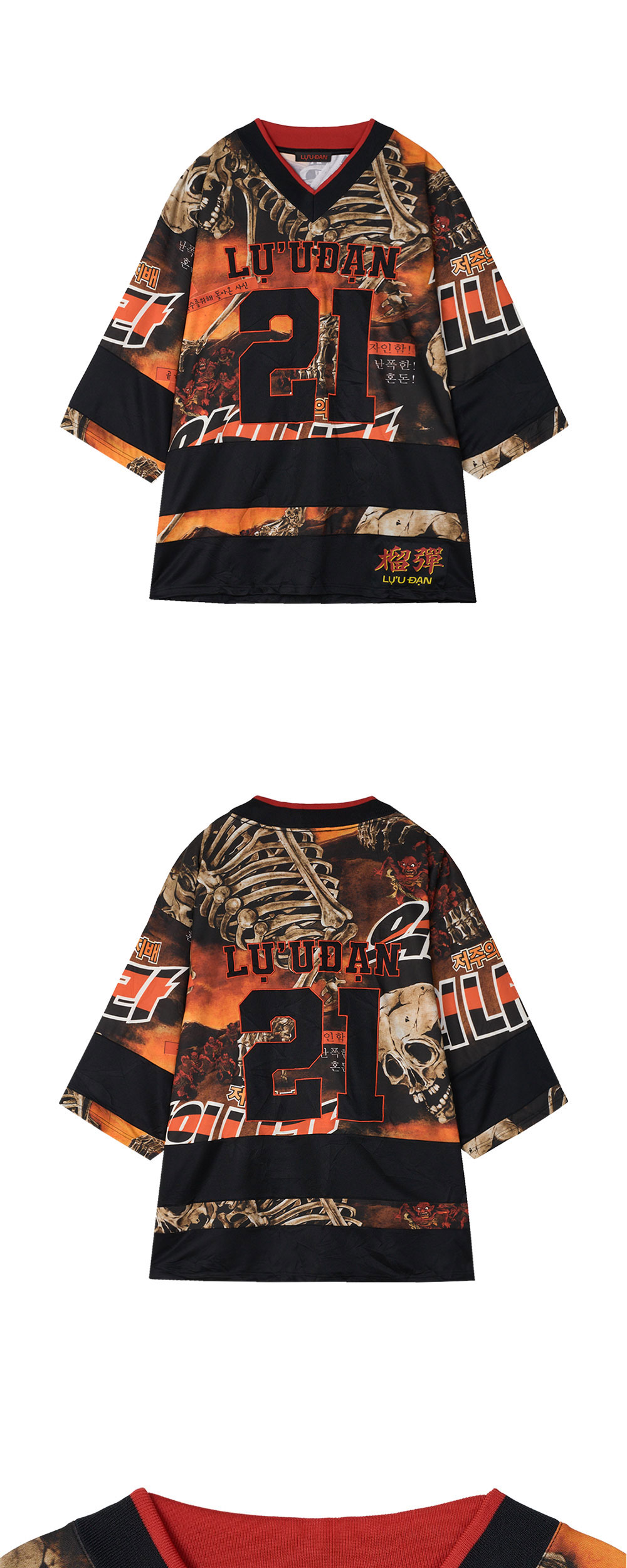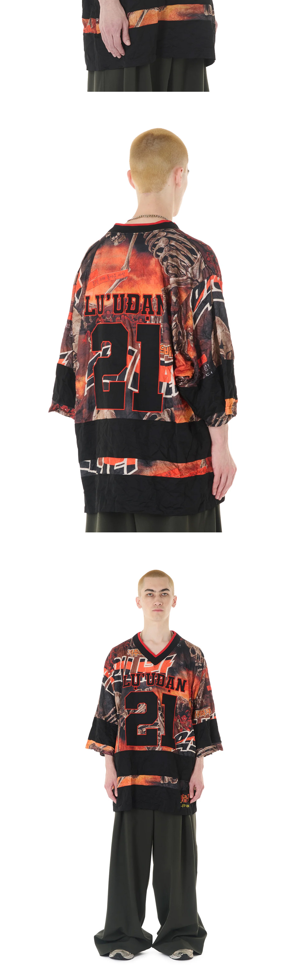 강렬한 그래픽으로 단품으로도 포인트가 되는 LU'UDAN의 Hockey Top L-D Reaper Movie입니다. -striped rib-knit V-neck -전, 후면 한글 그래픽 디테일 -드롭 숄더 & 오버핏 디자인