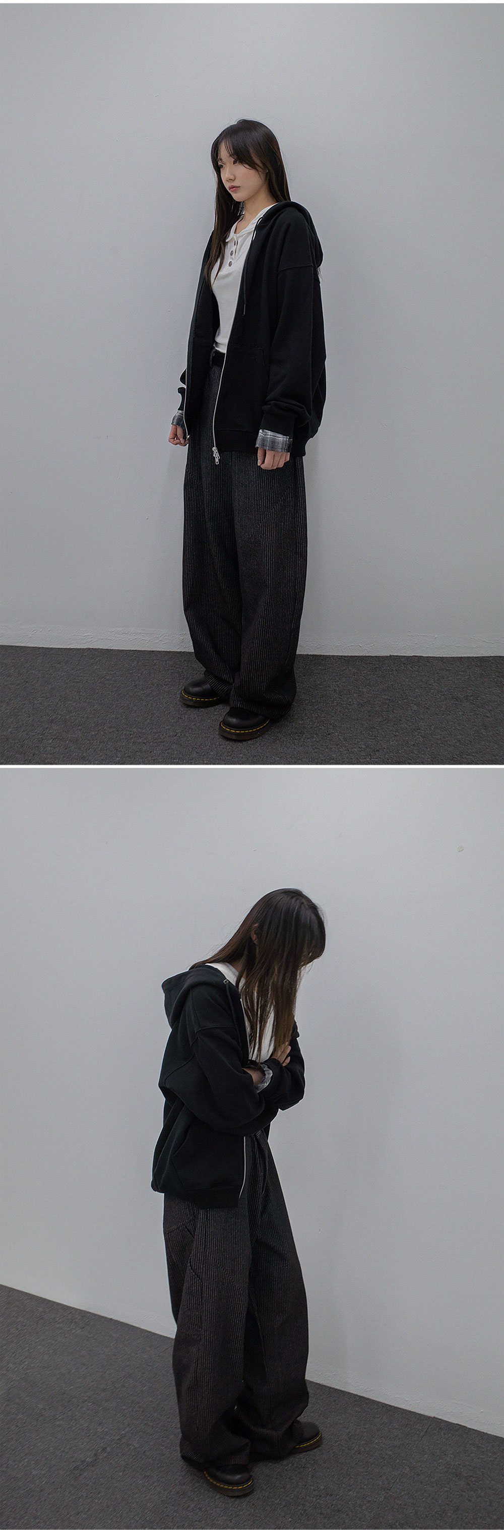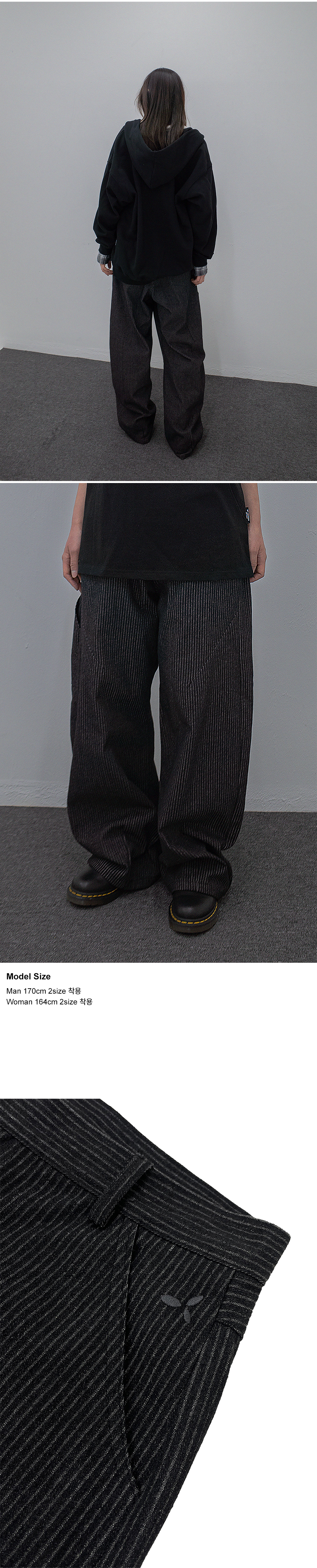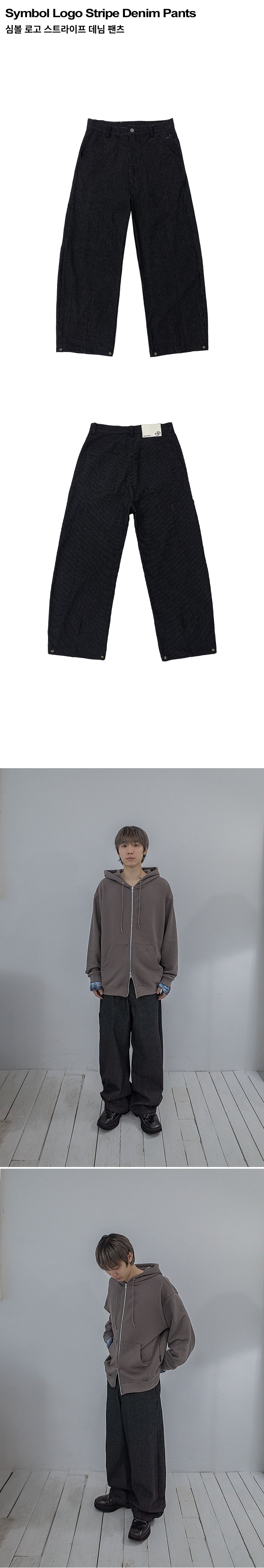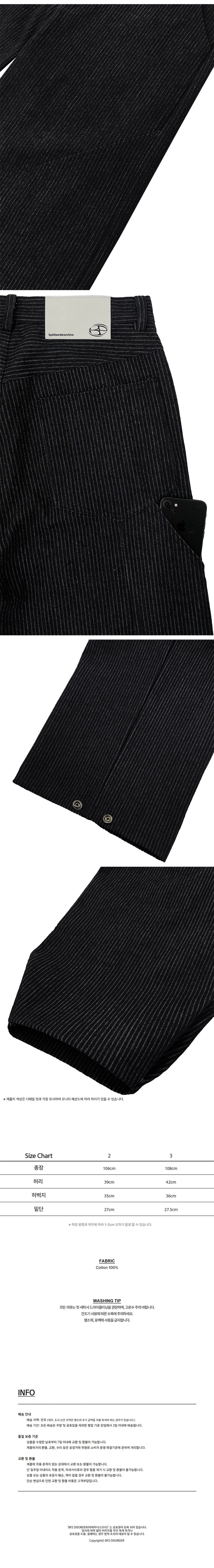 Made in korea - 여유로운 핏 - 주머니 심볼 로고 자수 - 허벅지, 밑단 다트 디테일 - 후면 카펜터 포켓 - 밑단 조절 스냅 - 고시감 있는 스트라이프 데님 원단 - YKK 지퍼