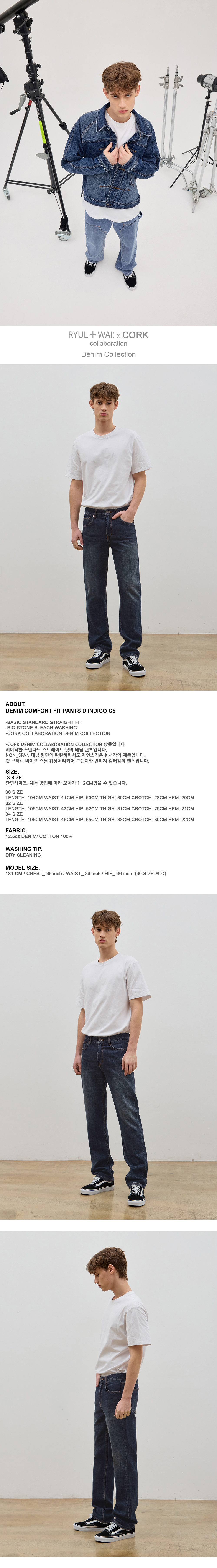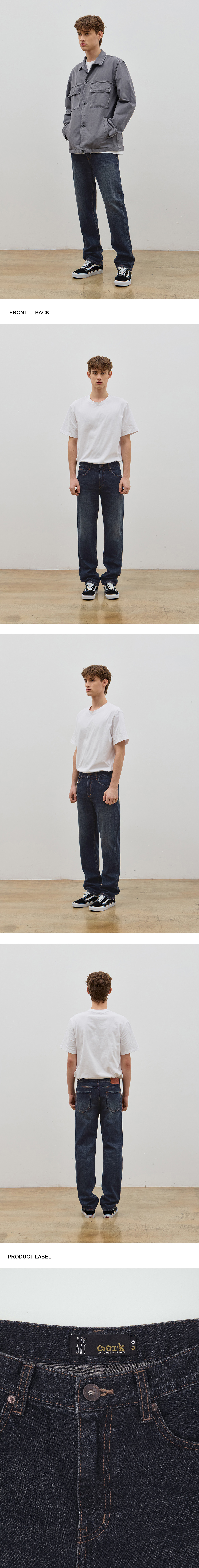 -CORK DENIM COLLABORATION COLLECTION 상품입니다. 베이직한 스탠다드 스트레이트 핏의 데님 팬츠입니다. NON_SPAN 데님 원단의 탄탄하면서도 자연스러운 텐션감의 제품입니다. 캣 브러쉬 바이오 스톤 워싱처리되어 트렌디한 빈티지 컬러감의 팬츠입니다.