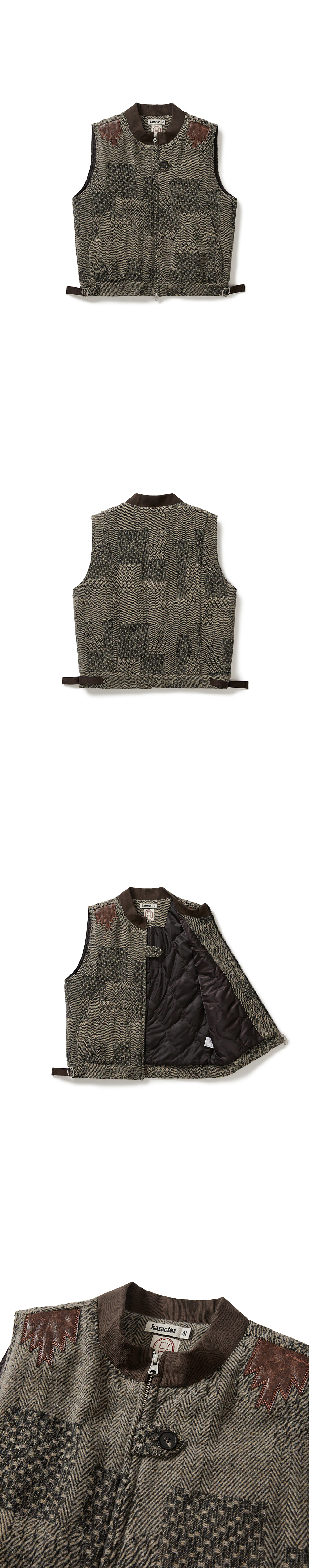 Product Info. - 불균형한 패턴의 독특한 울 혼방 패브릭 - 편안하게 착용 가능한 간절기용 집업 베스트 - 양쪽 숄더 웨스턴 무드의 가죽 패치 자수 디자인 - 2oz Thinsulate 얇은 두께감의 충전재 퀼팅 안감 - 전면 여밈 부 ykk 2-way zipper와 버튼 디테일로 다양한 연출 가능 - 볼륨감 있는 턱 디테일 패치드 포켓 디자인 - 후면 패널 액션 플리츠 디테일 - 양 사이드 밑단 사이즈 조절 가능한 스트랩 어드저스터 디테일 - ykk 택버튼 사용