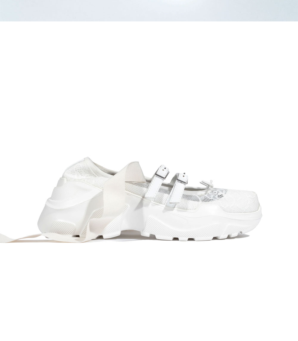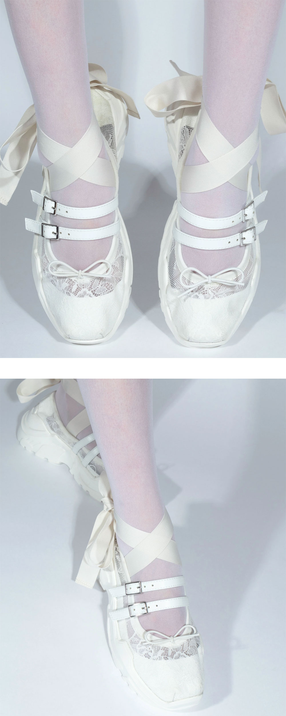 러블리한 무드가 눈에 띄는 Akikoaoki의 Women Giselle Lace White입니다. -어퍼에 시스루 레이스 소재 활용 -리본 디테일로 발레리나 슈즈를 형상화 -2개의 버클과 리본 스트랩 포인트로 여성스러운 무드 -스니커즈 밑창으로 더해진 스포티한 분위기가 특징