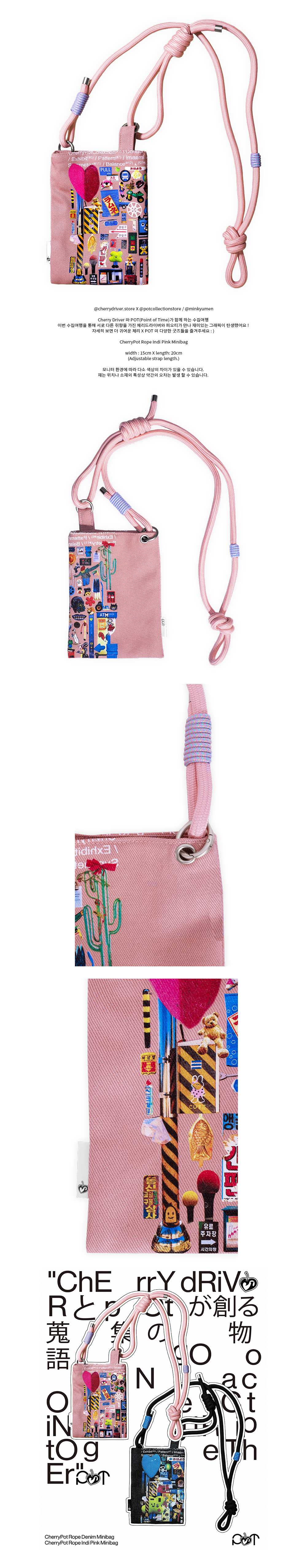 @cherrydriver.store X @potcollectionstore / @minkyumen Cherry Driver 와 POT(Point of Time)가 함께 하는 수집여행 이번 수집여행을 통해 서로 다른 취향을 가진 체리드라이버와 피오티가 만나 재미있는 그래픽이 탄생했어요 ! 자세히 보면 더 귀여운 체리 X POT 의 다양한 굿즈들을 즐겨주세요 : ) CherryPot Rope Indi Pink Minibag width : 15 X length : 20 cm (Adjustable strap length.) 모니터 환경에 따라 다소 색상의 차이가 있을 수 있습니다. 재는 위치나 소재의 특성상 약간의 오차는 발생 할 수 있습니다.
