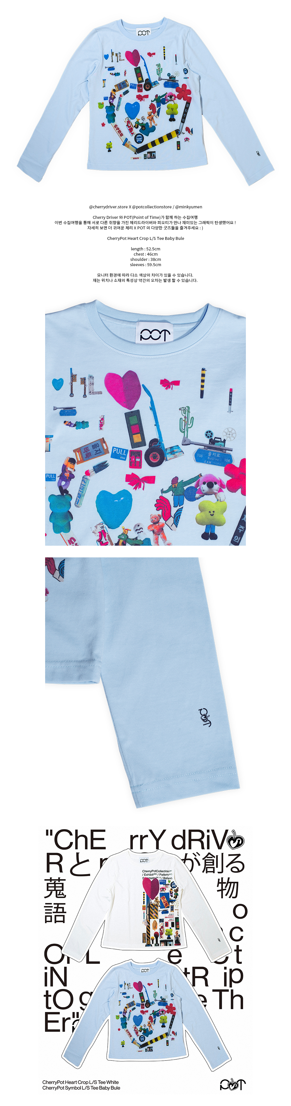 @cherrydriver.store X @potcollectionstore / @minkyumen Cherry Driver 와 POT(Point of Time)가 함께 하는 수집여행 이번 수집여행을 통해 서로 다른 취향을 가진 체리드라이버와 피오티가 만나 재미있는 그래픽이 탄생했어요 ! 자세히 보면 더 귀여운 체리 X POT 의 다양한 굿즈들을 즐겨주세요 : ) CherryPot Symbol L/S Tee Baby Bule length : 52.5cm / chest : 46cm / shoulder : 38cm / sleeves : 59.5cm 모니터 환경에 따라 다소 색상의 차이가 있을 수 있습니다. 재는 위치나 소재의 특성상 약간의 오차는 발생 할 수 있습니다.