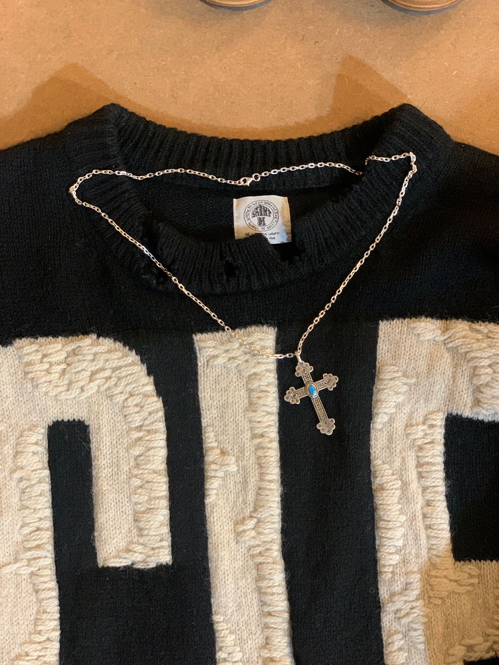 The Guys X RENDOE 렌도는 네이티브 아메리칸 문화에서 영감을 받아 제품을 제작합니다. 자연과 전통적인 패턴 및 상징을 고유한 스타일로 재해석하여 디자인하며, 공예와 현대적인 제작 기술을 활용하여 주로 상질의 가죽과 정은(silver925)으로 제품을 만들어냅니다. 제품설명 십자가 모양에 네이티브 패턴과 터키큐빅을 세팅함으로써 네이티브 아메리칸 주얼리적인 요소를 담아내었습니다. 펜던트 - 925 실버 / 중량 - 약 2.5돈(체인별도) 체인 - 925 실버 / 폭 2.8cm SIZE 펜던트(mm) - 가로 35 X 세로 45 체인 - 50cm 처음 제품을 받으시는 경우 체인이 워싱 작업이 안된 새제품으로 배송이 되어 펜던트와 컬러감이 이질적입니다. 제품 착용 후 1주일~2주일 이후 줄색상이 펜던트와 동일하게 변색이 됩니다.