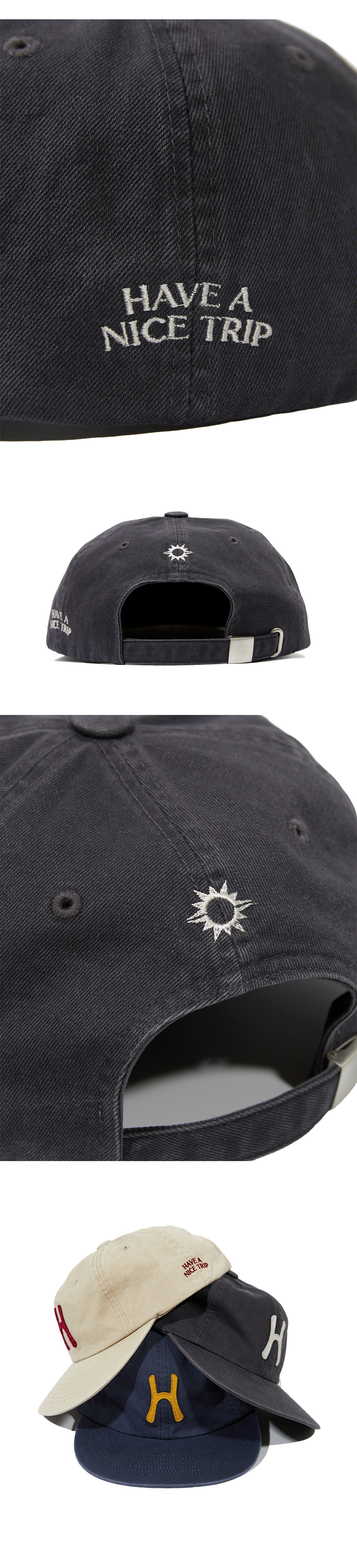 헬로선라이즈 H 로고 그래픽이 아플리케 자수로 들어간 6패널 캡입니다. - 기존 울 소재에서 코튼 버전으로 변형 - Relaxed Fit 으로 기존 6패널 캡보다 여유로운 착용감 - 옆면 Have a nice trip 포인트 자수 처리 - 뒷면 Hello Sunrise 심볼 자수 처리 * 모자의 챙을 개인적인 취향에 따라 원하시는 각도로 구부려 착용하시길 권장 드립니다. * 앞판에 생기는 주름은 워싱 과정상의 자연스러운 현상으로 반품사유가 되지 않습니다. * 앞판 H로고에 자연스러운 이염은 빈티지한 워싱을 의도한 것으로 반품사유가 되지 않습니다. * Cotton 100% Made in Korea