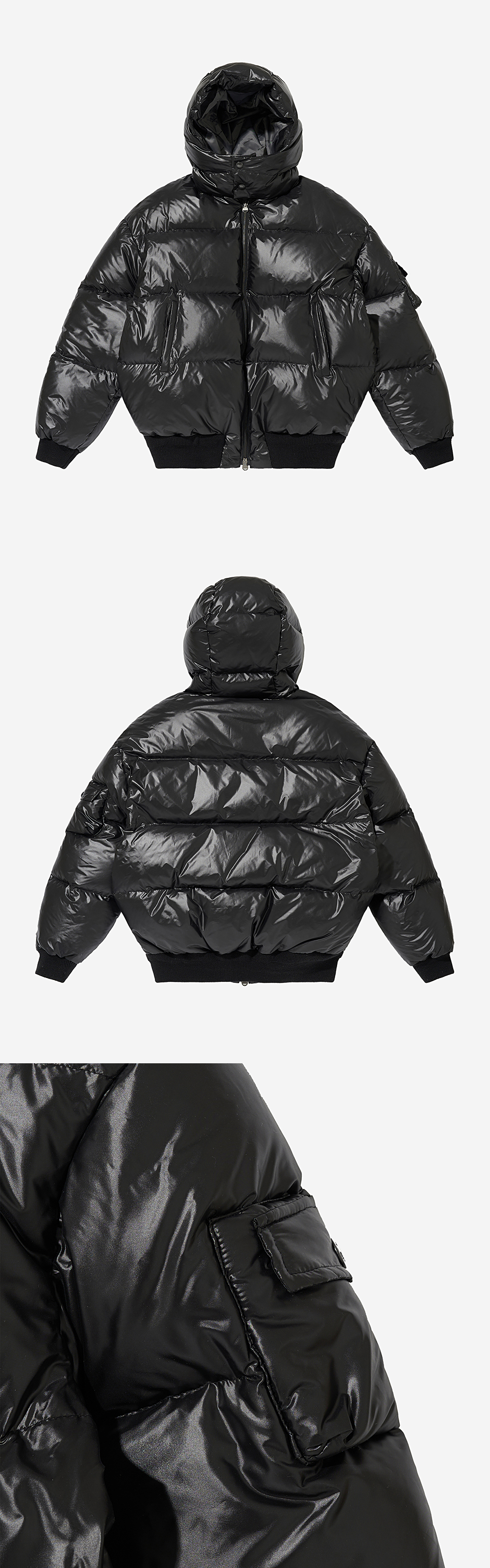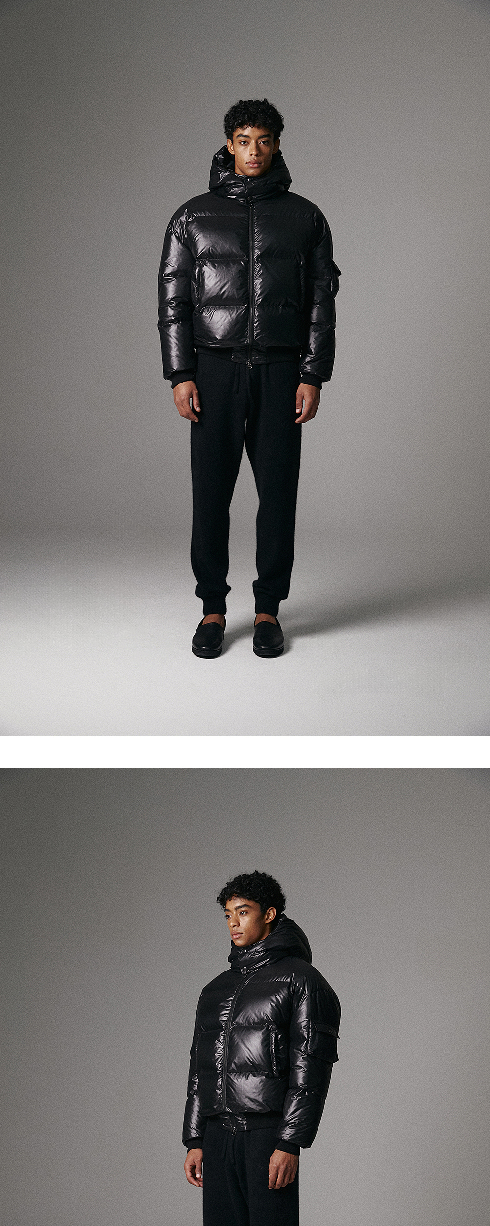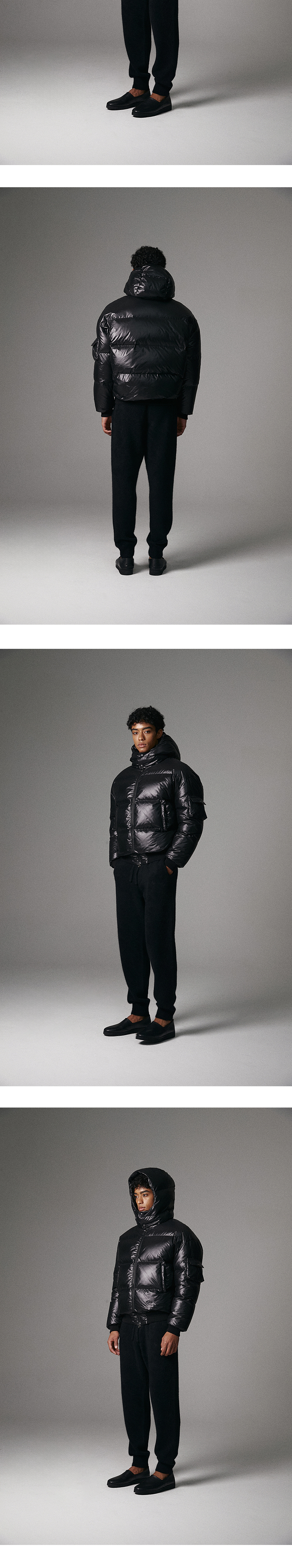 LAMPO 투웨이 지퍼, 로고 스냅, 울블렌드 시보리, 정전기 방지 원단 필파워 700의 구스다운을 최대치로 주입하여 완성한 헤비다운 후드 자켓 -Antistatic Protection -Lampo zipper -Logo snap button -Fill Power 700 Prauden Goose Down 450g -MODEL : 187CM 77KG TOP - L BOTTOM - M TOP - S (~98), M (~103), L (~108), XL (110~)