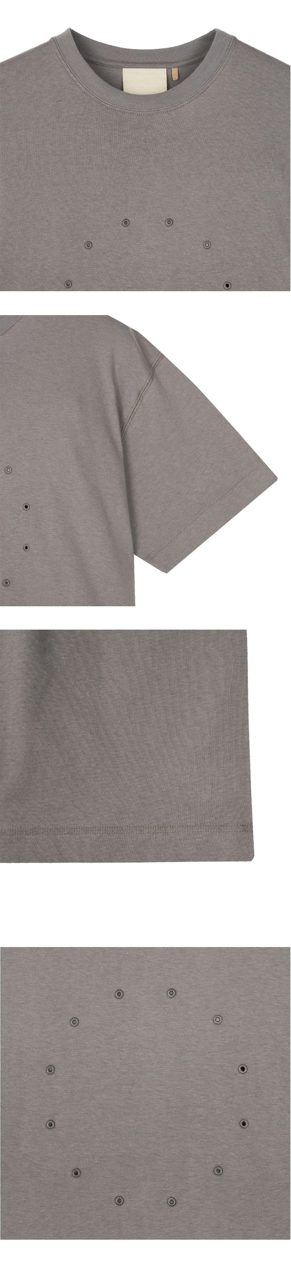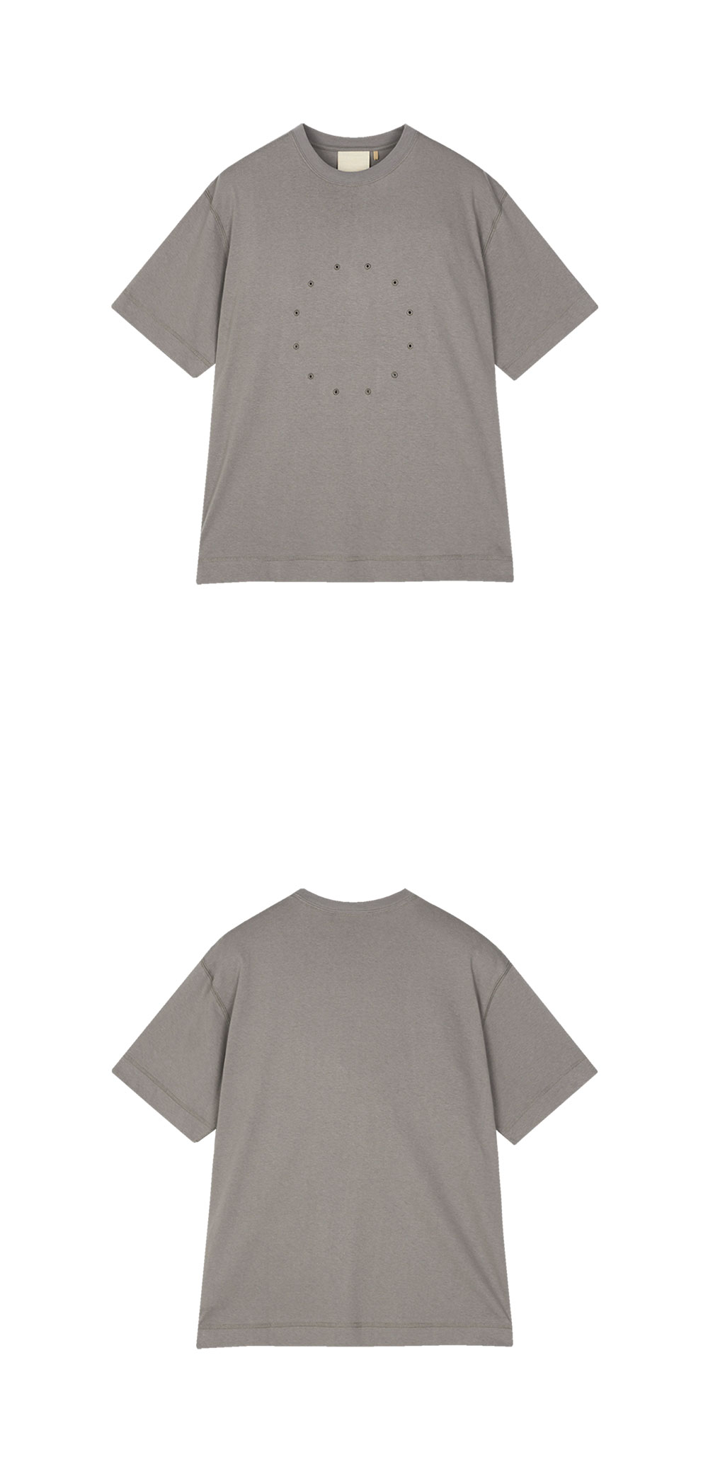 프론트의 원형 아일렛 디테일이 돋보이는 지안 예의 써클 티 그레이입니다. - 앞면에 원형 아일렛 디테일 - 단독 또는 이너로 스타일링 가능 - 부드럽고 매끄러운 100% 코튼 소재 - Made in Japan