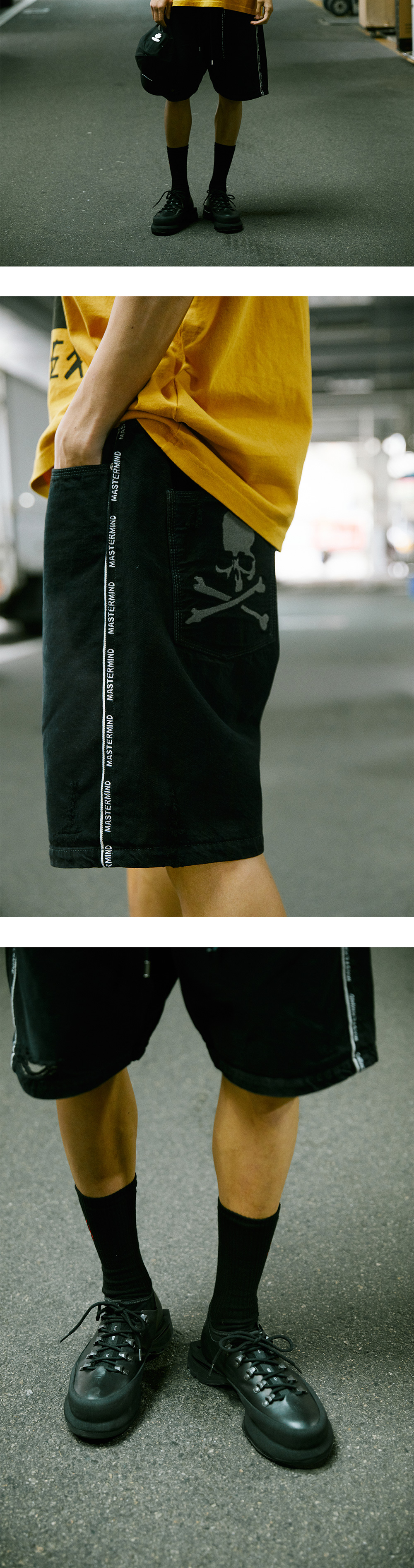 다양한 디테일로 단품 착용 시에도 포인트가 되는 마스터마인드 재팬의 인사이드 아웃 데님 쇼츠 블랙입니다. - 신축성 있는 허리 밴드, 드로우스트링 디자인 - 벨트 루프의 D링 - 5 포켓 - 전면과 후면의 자수 로고 디테일 - 힙 주머니 쪽 깃발 로고 - 로고가 새겨진 실버 톤 하드웨어