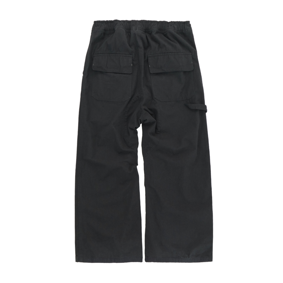 painter pajama pants - black, ink, beige - 전면 입체 패치 포켓 및 페인터 팬츠 디테일 적용 - 착용 시 슈즈 위로 부드럽게 떨어지는 실루엣 - 와이드-플레어드-배기 사이의 실루엣 - 밴딩 웨이스트 - 뒷면 플랩 포켓과 페인터 팬츠 디테일 - 후면 밑단 덧댐 디테일 - 키링 결착 가능한 전면 D링 디테일 - 넉넉한 기장으로 완성되며, 선호에 따라 기존 팬츠 제품 대비 조금 더 높은 위치로 올려입어 착용하셔도 무방한 패턴 *모델1: 178cm / 마른 체형, 3사이즈 착용 *모델2: 170 중반 / 마른 체형, 3사이즈 착용 *직전 차수 대비, 보다 강한 워싱이 적용되어 푸른 빛의 블랙으로 완성되었습니다.