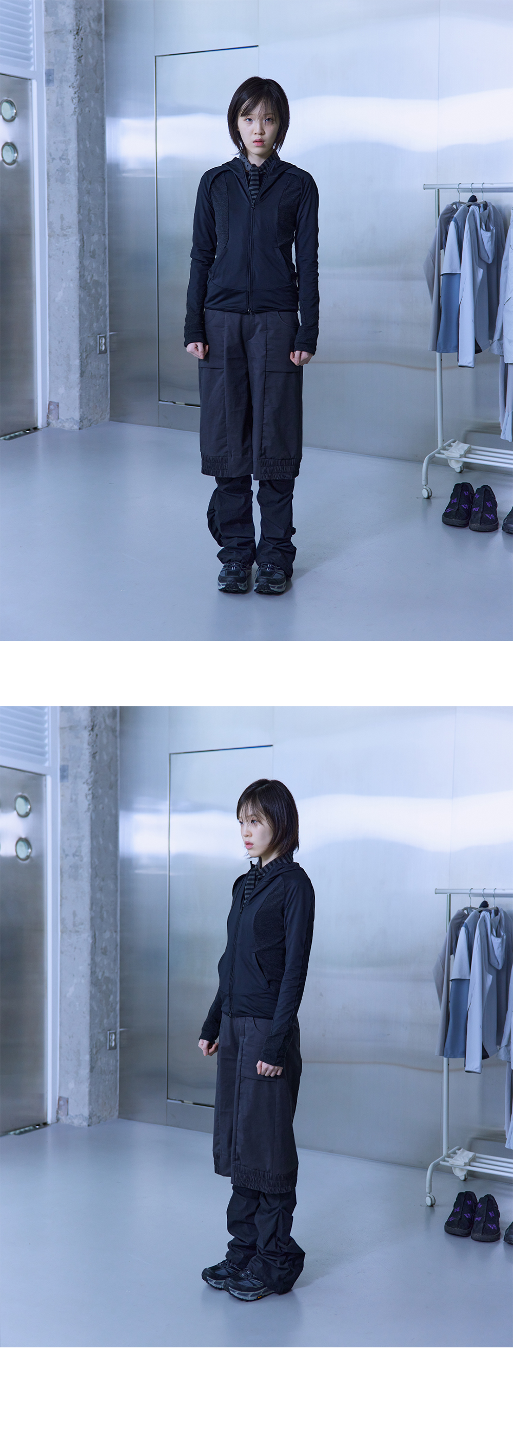 버뮤다 & 셔링 팬츠의 레이어드 디자인 사이드 셔링 디테일 버뮤다 밑단 밴딩 디테일 사이드 포켓 메쉬 안감 사용 밑단 스트링으로 길이 조절 가능 E-BAND 내장으로 다양한 사이즈 착용 가능