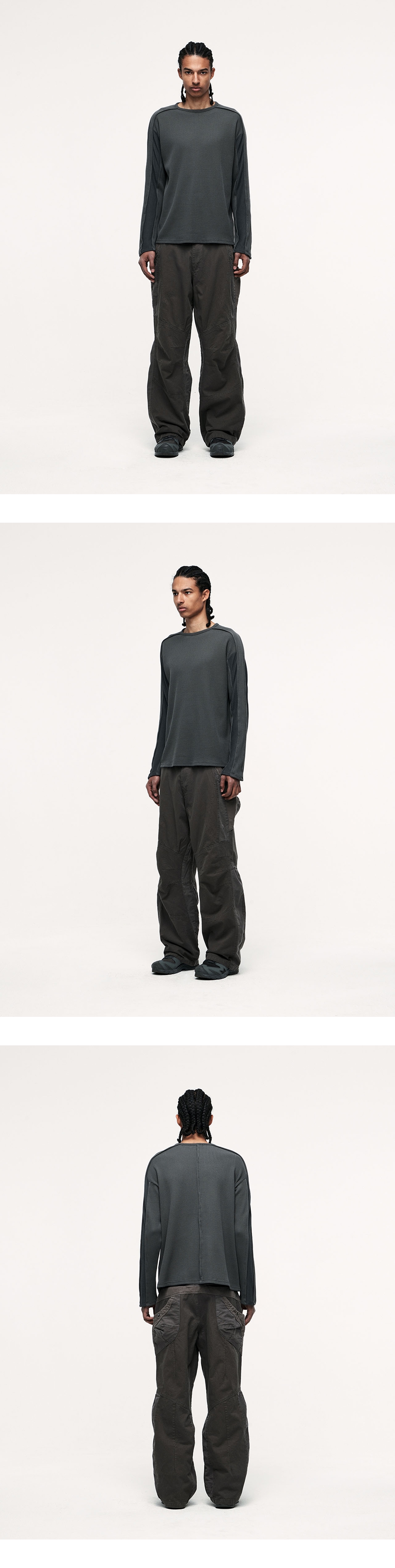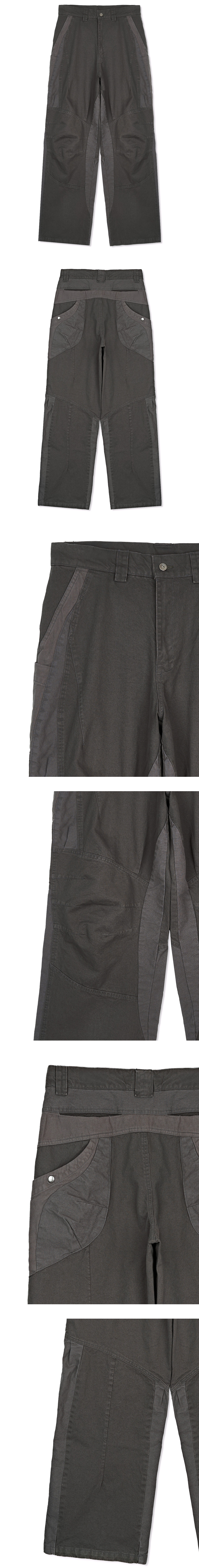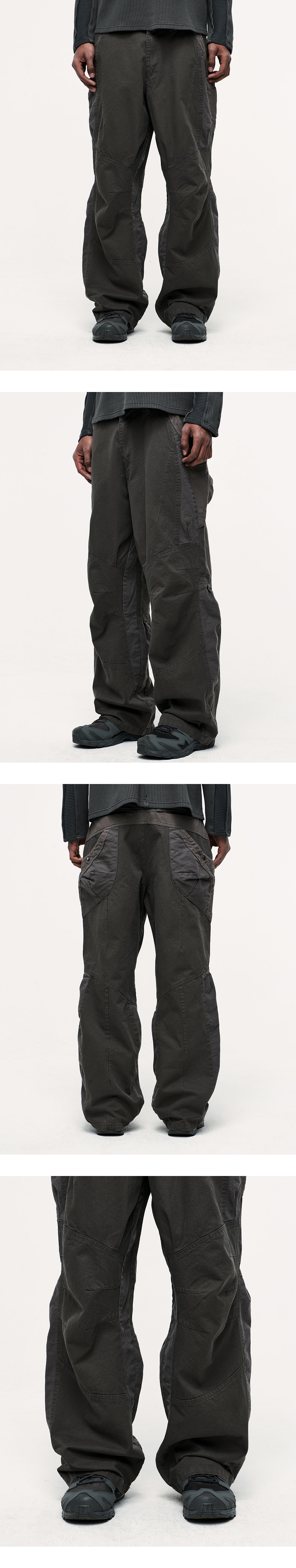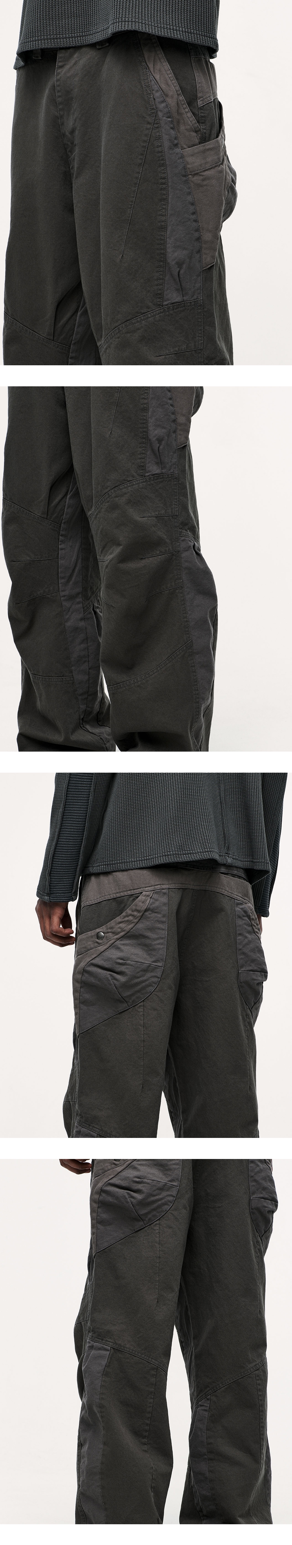 *디스트레스트 연출을 위해 바이오 워싱 작업이 진행되었으며, 이로 인해 의류 표면에 약간의 필링이 발생할 수 있습니다. 이는 자연스러운 공정의 일환으로, 불량이 아님을 참고 부탁드립니다. YKK 지퍼 바이오 워싱 기법 무릎 다트 디테일 2개의 배색 원단 후면 입체 포켓 디자인 YKK ZIPPER BIO WASHING TECHNIQUE KNEE DART DETAIL 2 FABRIC PANNEL BACK 3D POCKET DESIGN