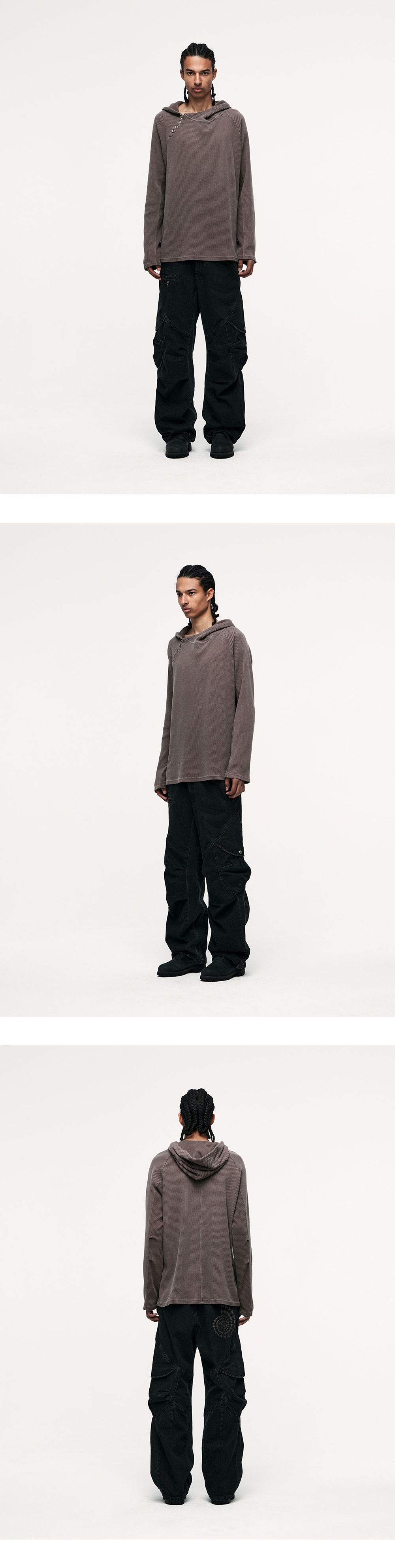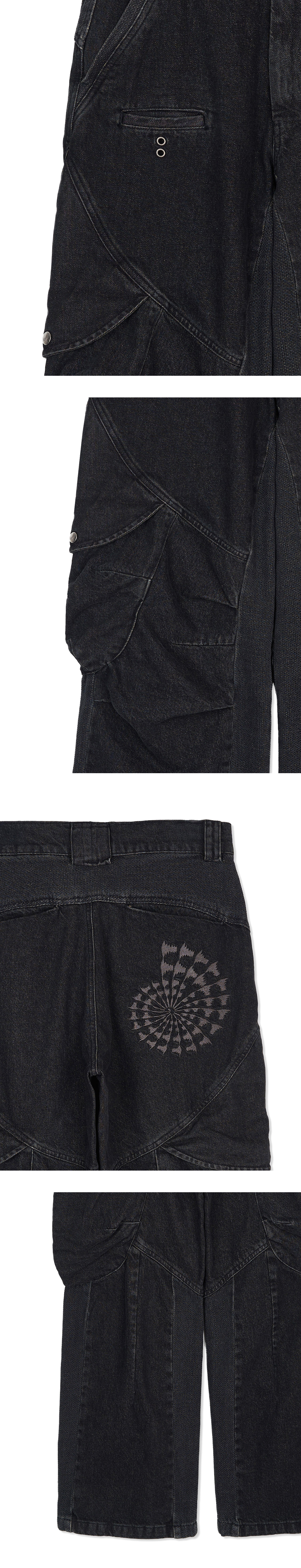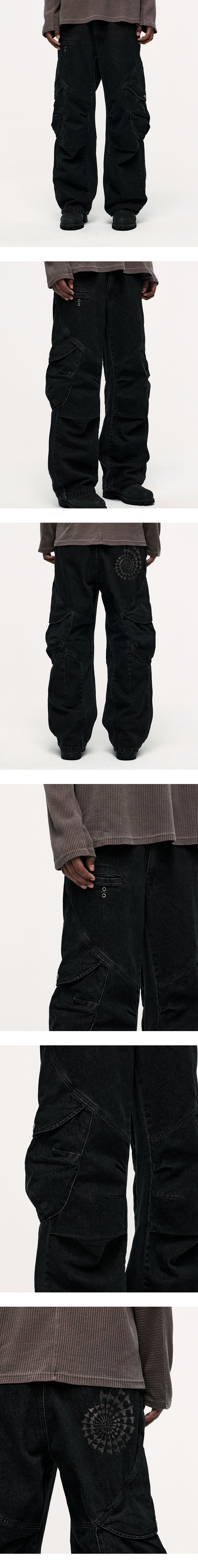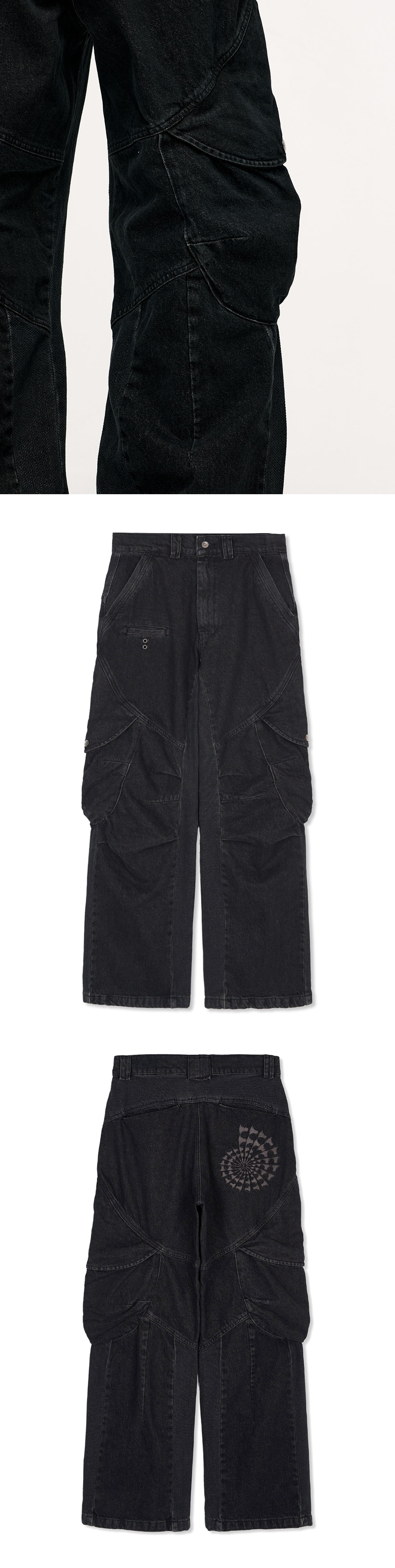 YKK 지퍼 무릎 핀턱/다트 디테일 전면 작은 포켓 입체 포켓 디자인 후면 'AMMONITE' 그래픽 YKK ZIPPER KNEE PIN TUCK/DART DETAIL FRONT SMALL POCKET 3D POCKET DESIGN BACK 'AMMONITE' GRAPHIC