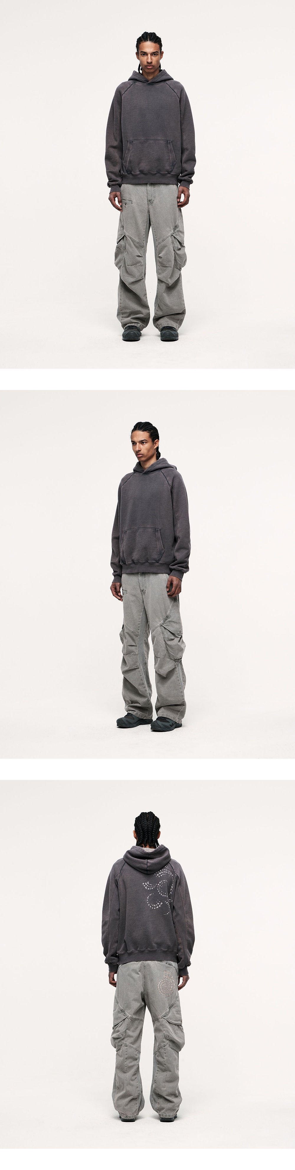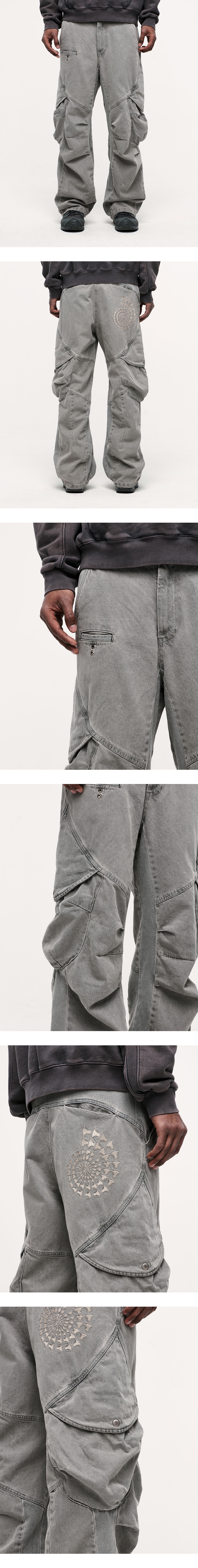 YKK 지퍼 무릎 핀턱/다트 디테일 전면 작은 포켓 입체 포켓 디자인 후면 'AMMONITE' 그래픽 YKK ZIPPER KNEE PIN TUCK/DART DETAIL FRONT SMALL POCKET 3D POCKET DESIGN BACK 'AMMONITE' GRAPHIC