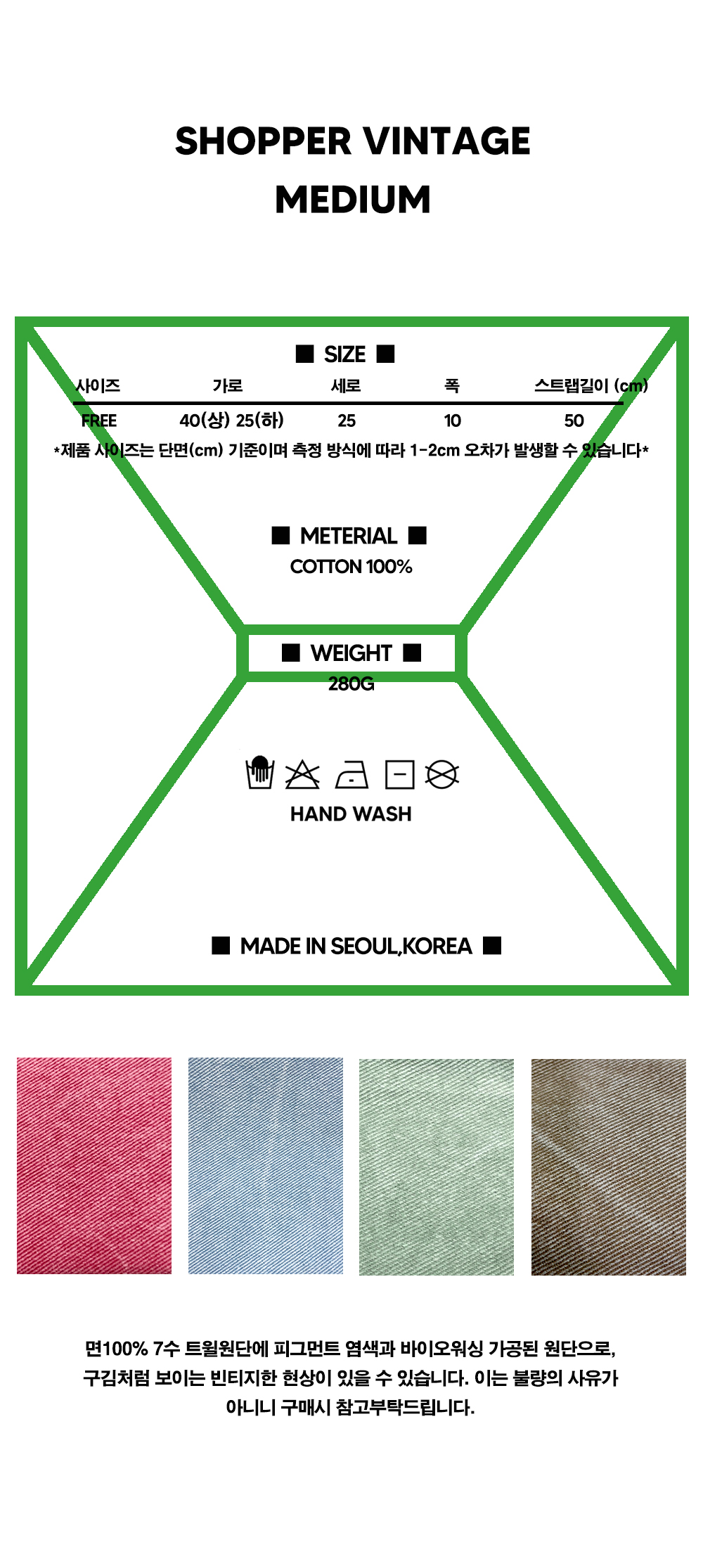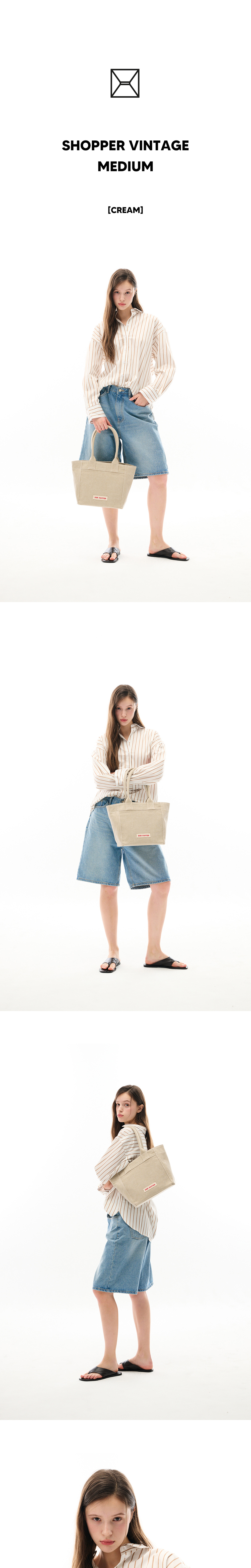 우리의 시그니처 제품인 SHOPPER CANVAS 가 새로운 모습으로 찾아왔습니다. 기존의 선명한 캔버스 컬러에서 벗어나, 이번 시즌에는 워싱 처리된 빈티지 원단을 사용해 더욱 부드럽고 은은한 매력을 선보입니다. 봄의 따스함을 담은 이 새로운 SHOPPER VINTAGE 는 일상 속 자연스러운 스타일링을 완성시켜줄 것입니다. 부담 없는 색감과 편안한 텍스처로, 어떤 옷차림에도 쉽게 어울리는 실용적인 아이템입니다.