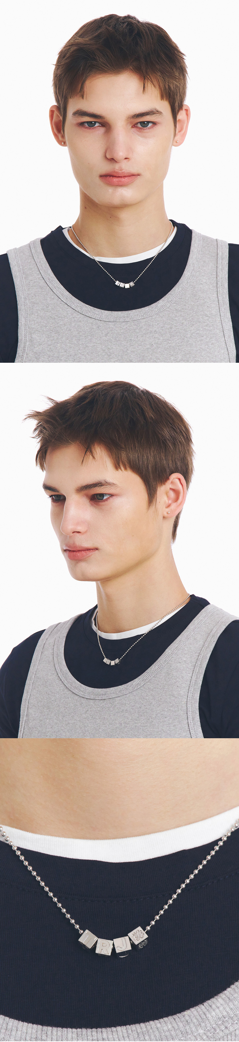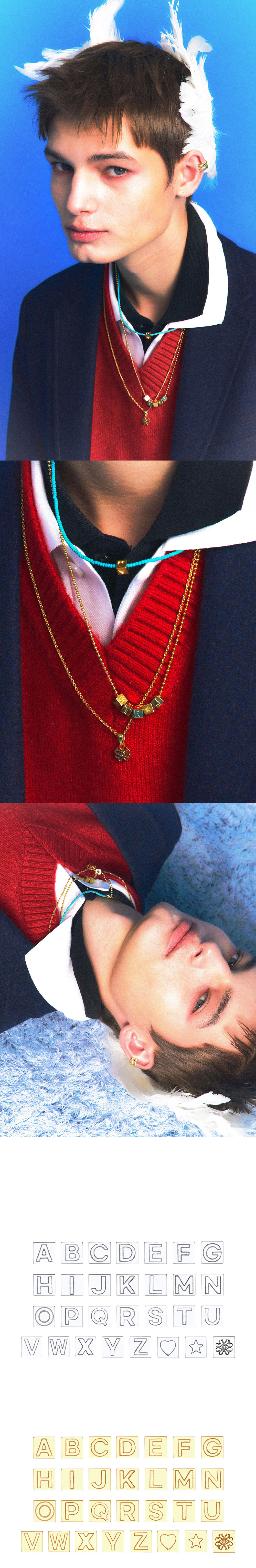 주문제작 상품 (주문 후 7-10일 이내 출고) Blue Diamond Settings 모던함과 빈티지함이 공존하는 볼체인과 정육면체 이니셜 펜던트. A-Z 원하는 이니셜을 조합하여 의미를 담아 소장할 수 있는 주얼리.
