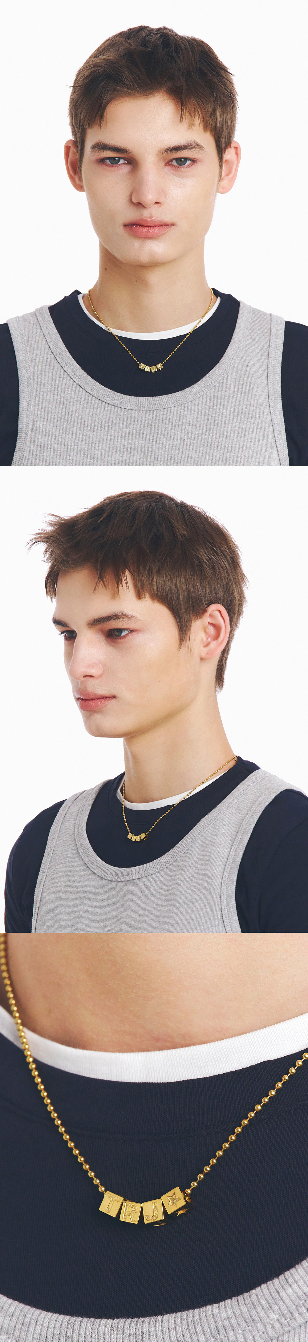 주문제작 상품 (주문 후 7-10일 이내 출고) Blue Diamond Settings 모던함과 빈티지함이 공존하는 볼체인과 정육면체 이니셜 펜던트. A-Z 원하는 이니셜을 조합하여 의미를 담아 소장할 수 있는 주얼리.
