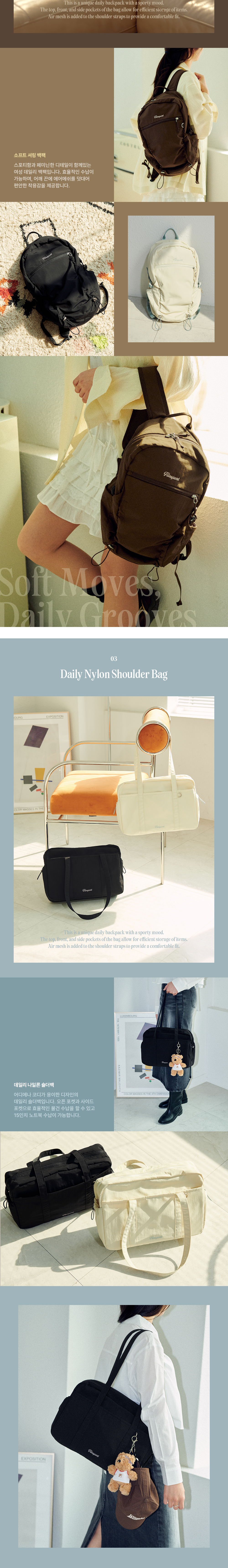 <데일리 숄더백>어디에나 코디가 용이한 디자인의 데일리 숄더백입니다.<다양한 수납>가방 앞면의 오픈 포켓과 사이드 포켓으로 효율적인 물건 수납이 가능합니다.<15인치 노트북 수납 가능>가방 내부에 노트북슬리브와 몸판이 무너지지 않게 잡아줄 수 있는 속고판이 부착되어 있습니다.