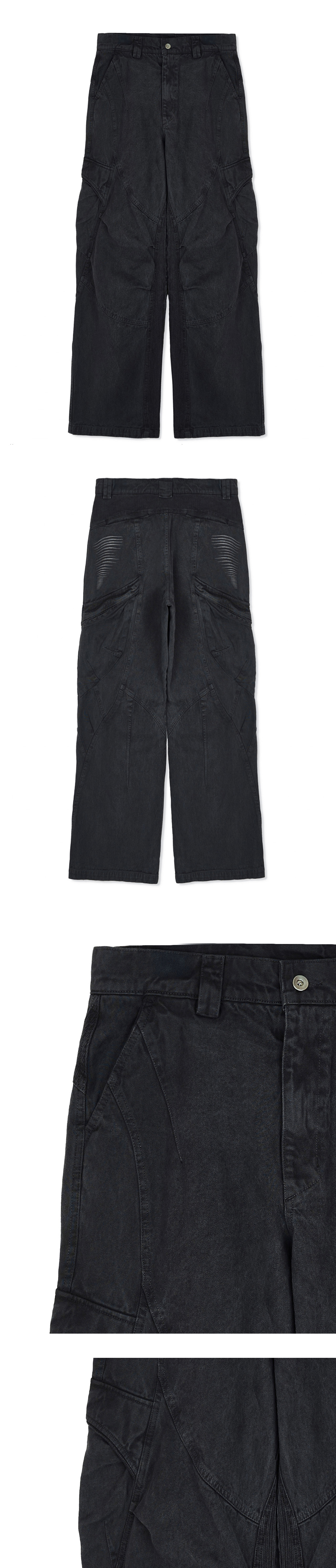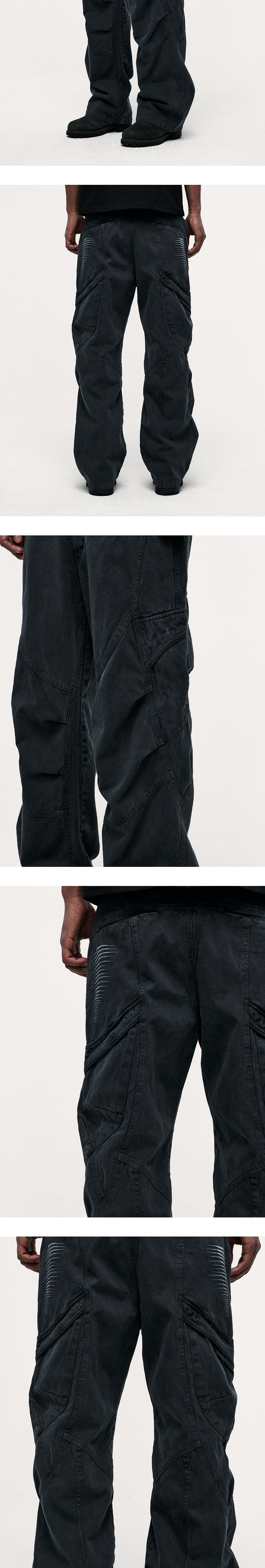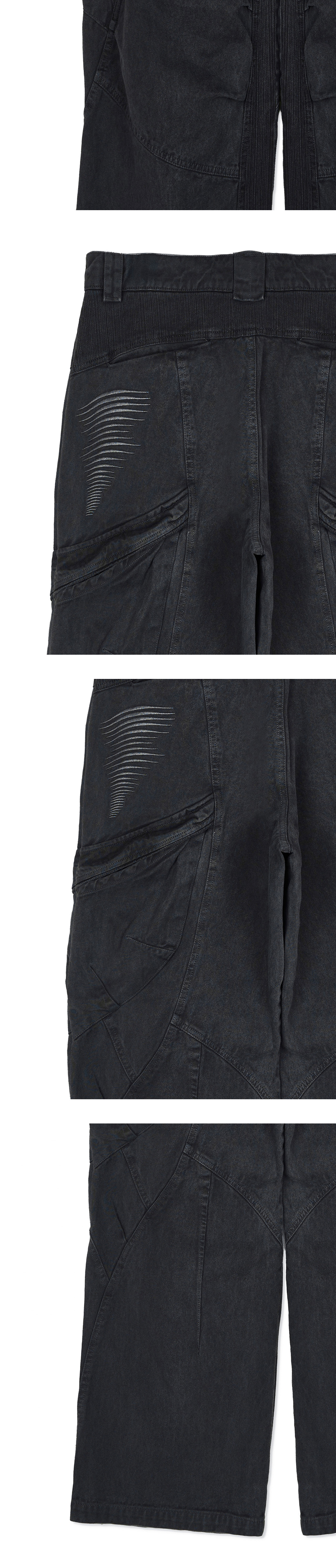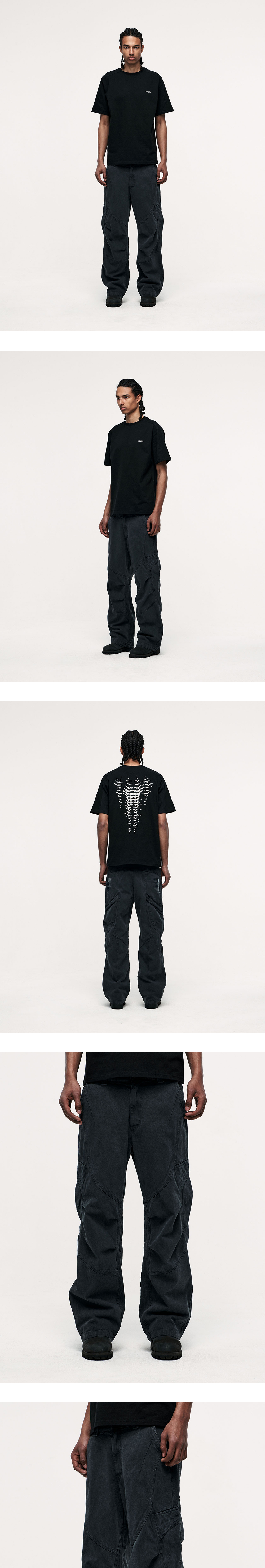 *가먼트 다잉 기법으로 제작된 제품입니다. 밝은 의류와 착용시 이염이 될 수 있으니 주의 부탁드리겠습니다. YKK 지퍼 가먼트 다잉 기법 무릎 턱 디테일 입체 포켓 디자인 후면 'AMMONITE' 자수 YKK ZIPPER GARMENT DYING TECHNIQUE KNEE DART DETAIL 3D POCKET DESIGN BACK 'AMMONITE' EMBROIDERY