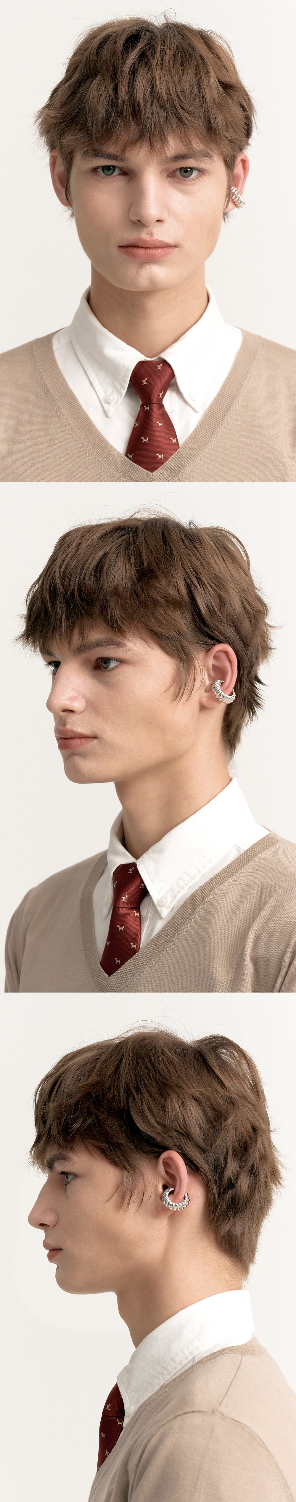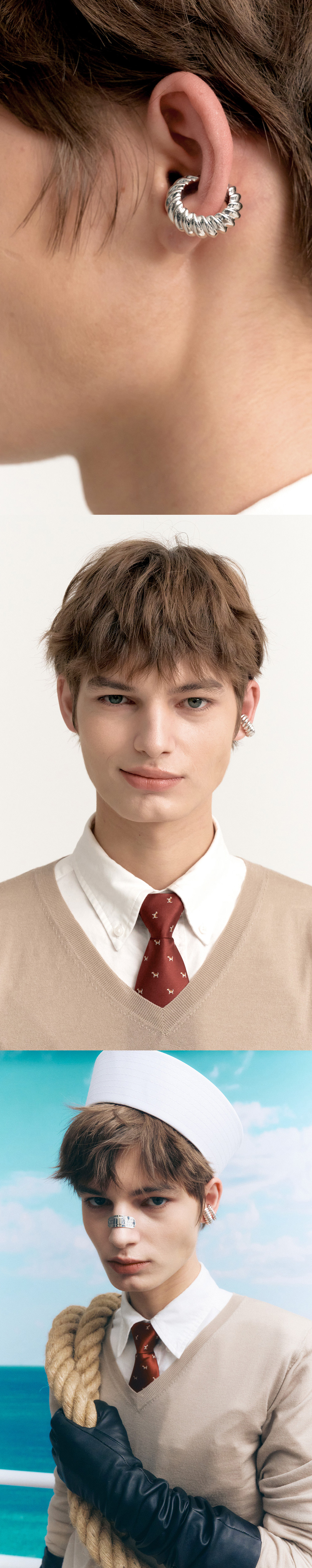 주문제작 상품 (주문 후 7-10일 이내 출고) Blue Diamond Settings. 시즌 컨셉인 'Sailer'의 투박한 밧줄에서 영감을 받은 트위스트 디테일의 이어커프. 밧줄의 굴곡을 정교하게 표현한 핸드메이드 제품. 드라마틱한 볼륨감으로 쿨한 스타일링을 도와줄 아이템.