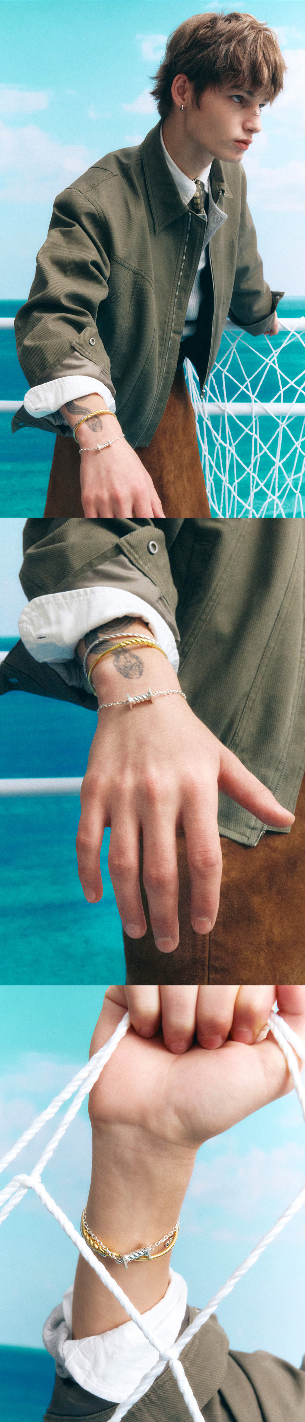주문제작 상품 (주문 후 7-10일 이내 출고) Blue Diamond Settings. 시즌 컨셉인 'Sailer'의 투박한 밧줄에서 영감을 받은 트위스트 디테일의 브레이슬릿. 밧줄의 굴곡을 정교하게 표현한 핸드메이드 제품. 볼드하고 빈티지한 무드로 웨어러블하게 착용할 수 있는 아이템.