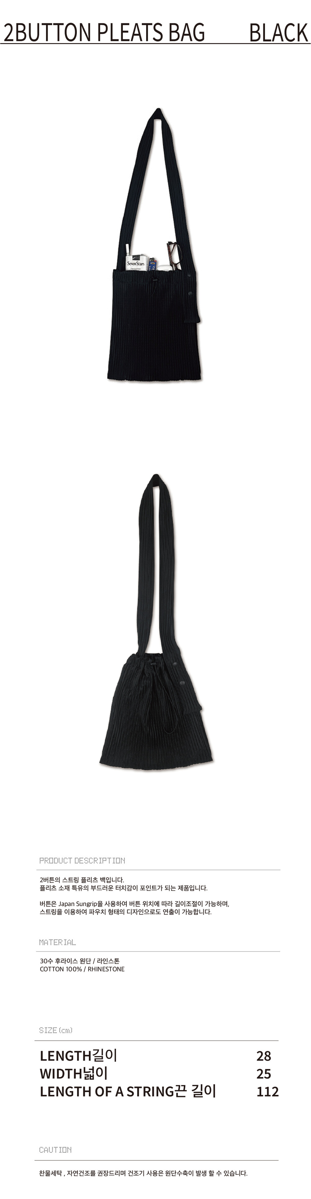 2버튼의 스트링 플리츠 백입니다. 플리츠 소재 특유의 부드러운 착용감이 포인트가 되는 제품입니다. 버튼은 Japan Sungrip을 사용하여 버튼 위치에 따라 길이조절이 가능하고, 스트링을 이용하여 파우치 형태의 디자인으로도 연출이 가능합니다.