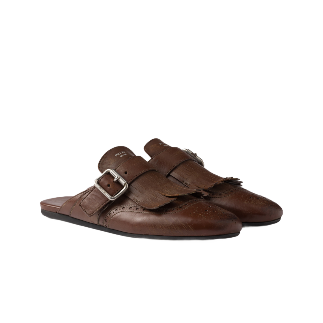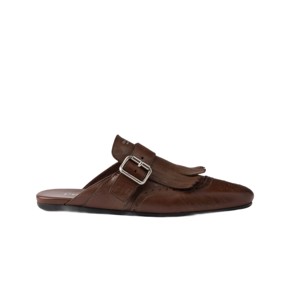 (W) 프라다 셔플 프린지드 레더 뮬 코냑